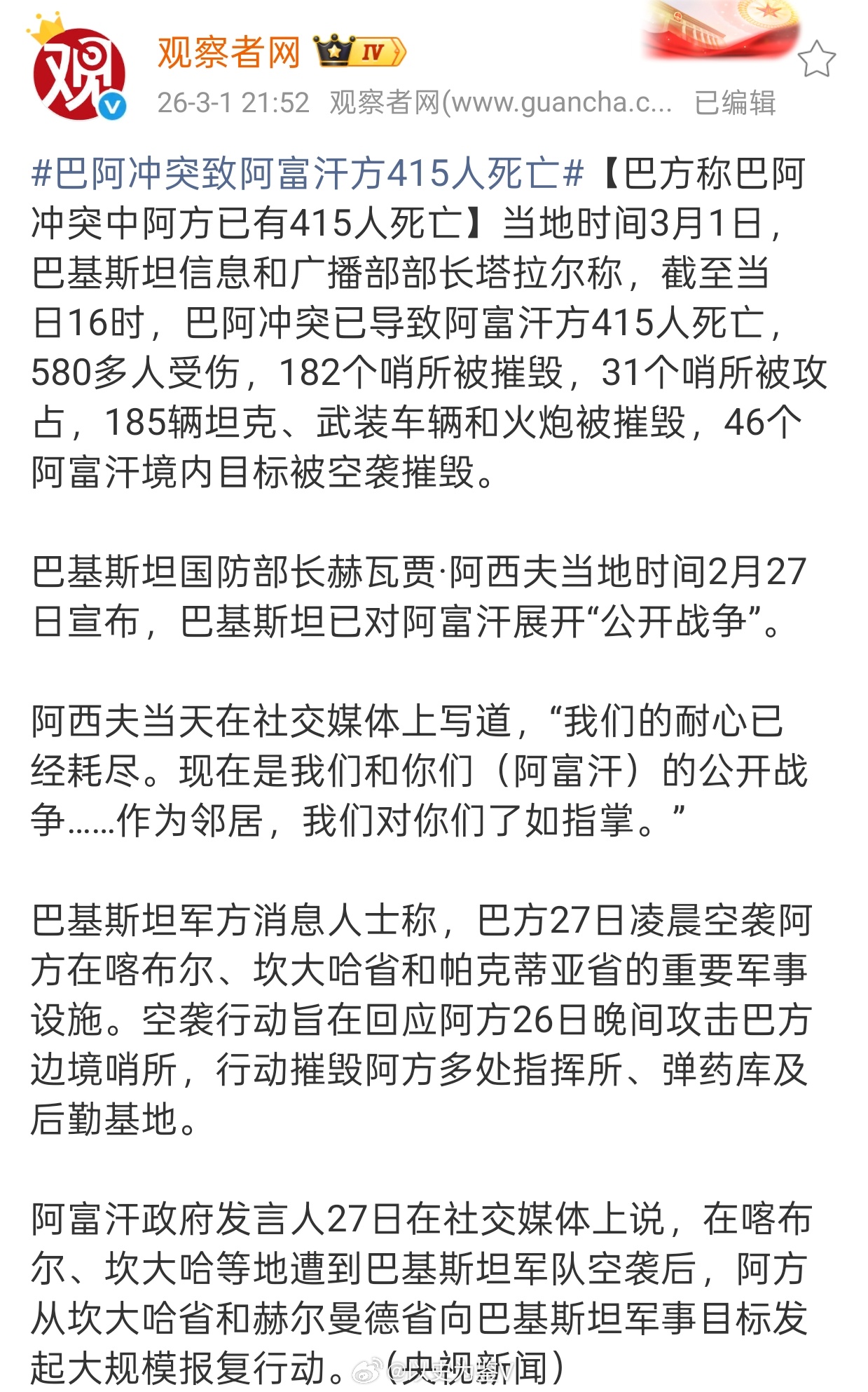 阿富汗使用重型武器打击巴基斯坦阿富汗巴基斯坦交火 我看到有人问巴基斯坦和阿富汗爆发战争,谁是我们这边的……
