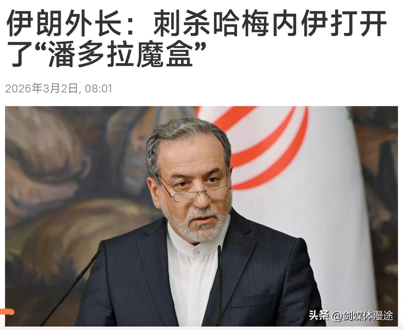 伊朗外长一封信致 联合国 秘书长 及国理会及其它外交部长写道:刺杀伊朗最高领袖哈梅内伊打开了“潘多拉魔盒”,接下来伊朗的行动将由不得别人说了算了! 美国一边用谈判当作幌子 欺骗伊朗 ,而伊朗用诚意参与美伊谈判,而美国背后谋划与施实对伊朗最高领袖的“斩首”这对伊朗国家及民族是蔑视及对伊朗国家的羞辱! 然而美以可以用这种无视国际法,史无前例的违背国家与国家之间的基本准则毫无诚信,美国与以色列已经破坏了主权平等的根基和国际体系的稳定,即然美国与以色列可以这么做,伊朗也是被逼到没有退路了,留给伊朗的路就只有两条:一是让美国接管伊朗 伊朗全民沦为殖民,另一条路就是伊朗全民无论用何种手段 为生存 为国家 为民族奋勇与美以对抗,直到争取全国族伟大胜利 将被侵略者送上断头台! 这是伊朗外长向联合国表达了对美国与以色列的不满 ,同时也向联合国表达了伊朗国家接下来将如何做。潘多拉魔盒打开了,就由不得美国与以色列为非作歹了,伊朗将奉陪到底 ! 自 2 月 28 日以来,美以两国杀伊民众 学生 老师 政府官员 同时对伊朗国内 2000 个多目标的军事打击。 俄罗斯总统普京表示,杀害哈梅内伊的行为是对人类道德的一切准则和国际法的公然践踏!