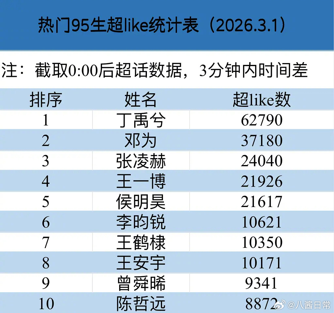 热门95生超like前十丁禹兮、邓为、张凌赫、王一博、侯明昊、李昀锐、王鹤棣、王安宇、曾舜晞、陈哲远