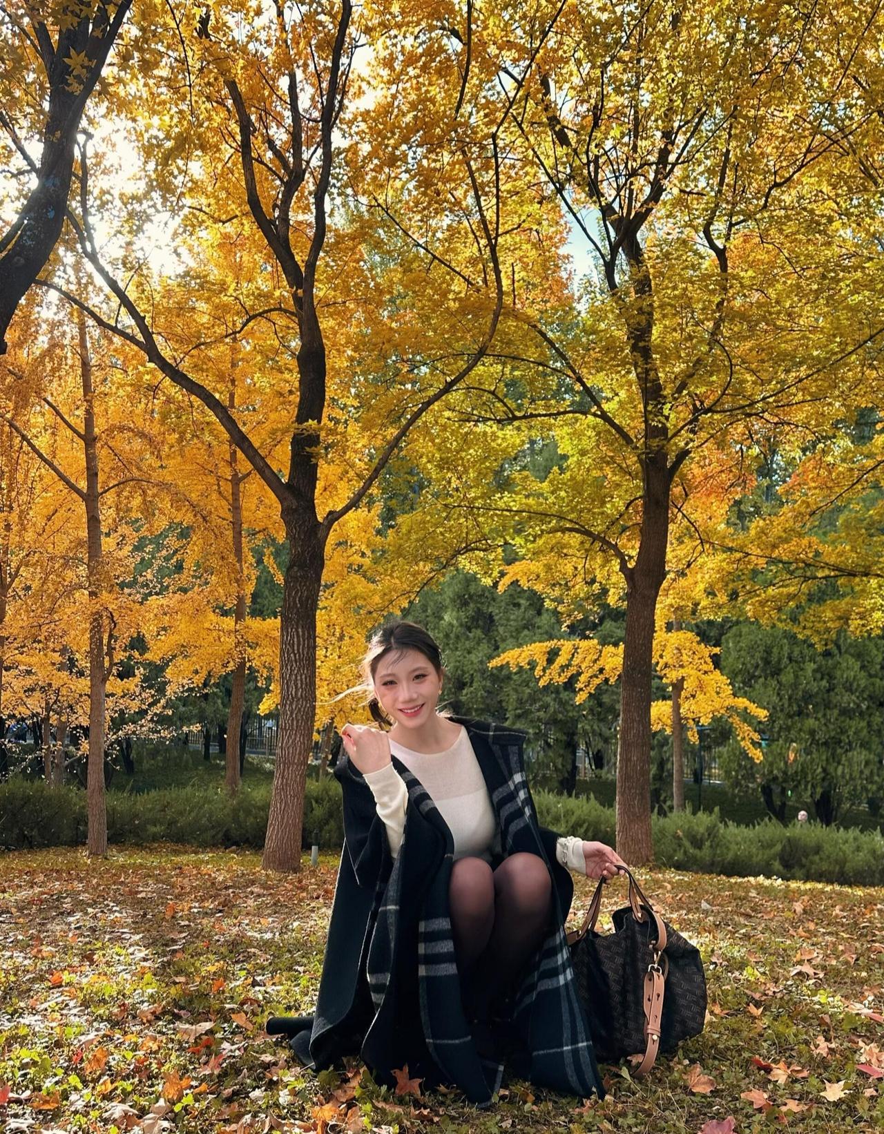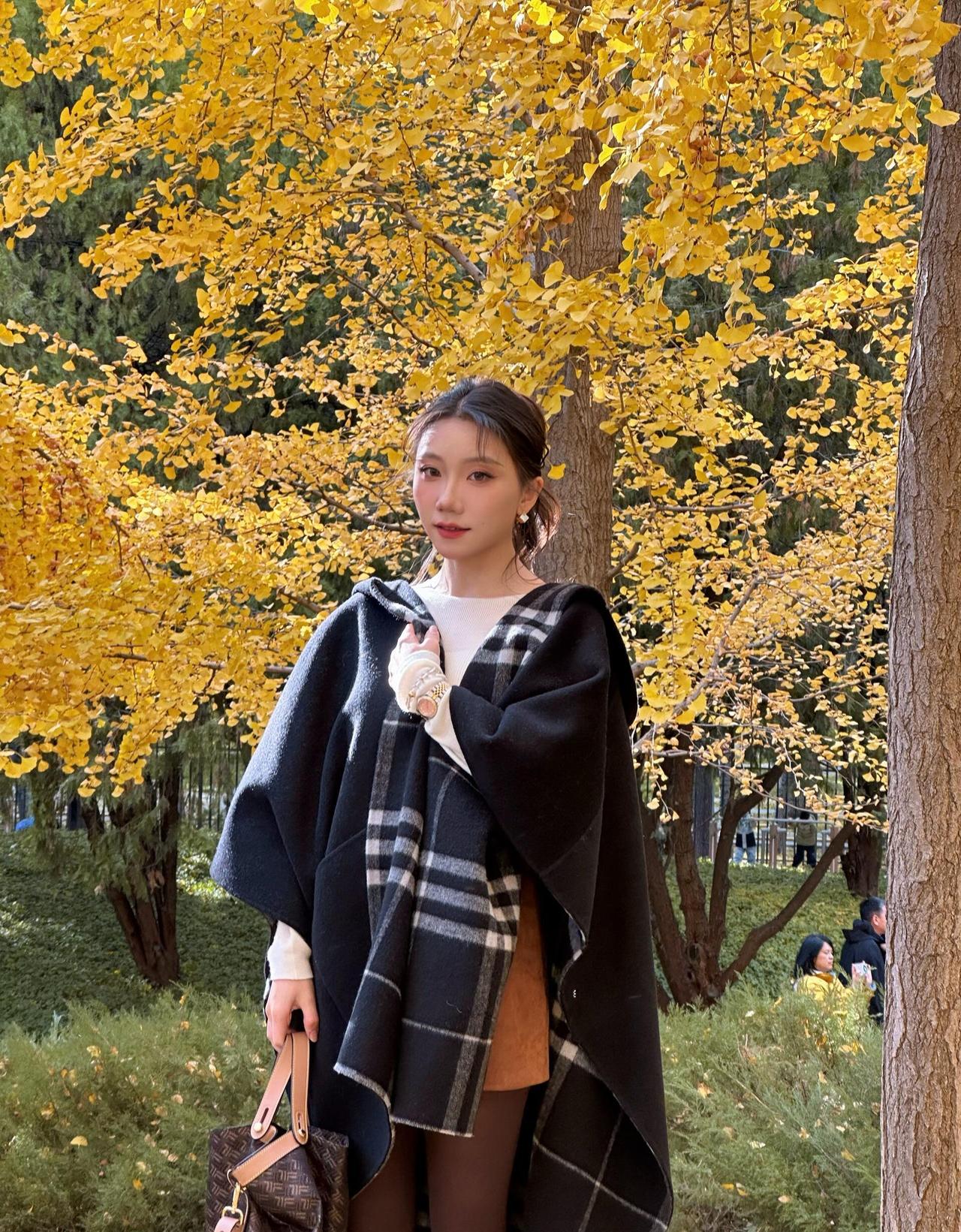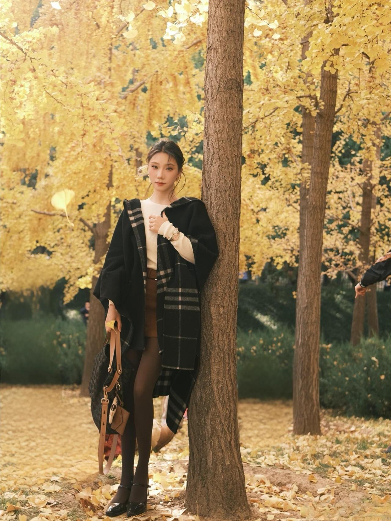 这套穿搭在银杏林里太有“秋日温柔知性风”的氛围了!黑大衣搭格纹围巾自带温暖质感,米白内搭+棕裙的配色刚好呼应秋景,搭配玛丽珍鞋添了精致细节,是舒服又耐看的秋日出街风格~大衣高级配色 温柔系大衣搭配