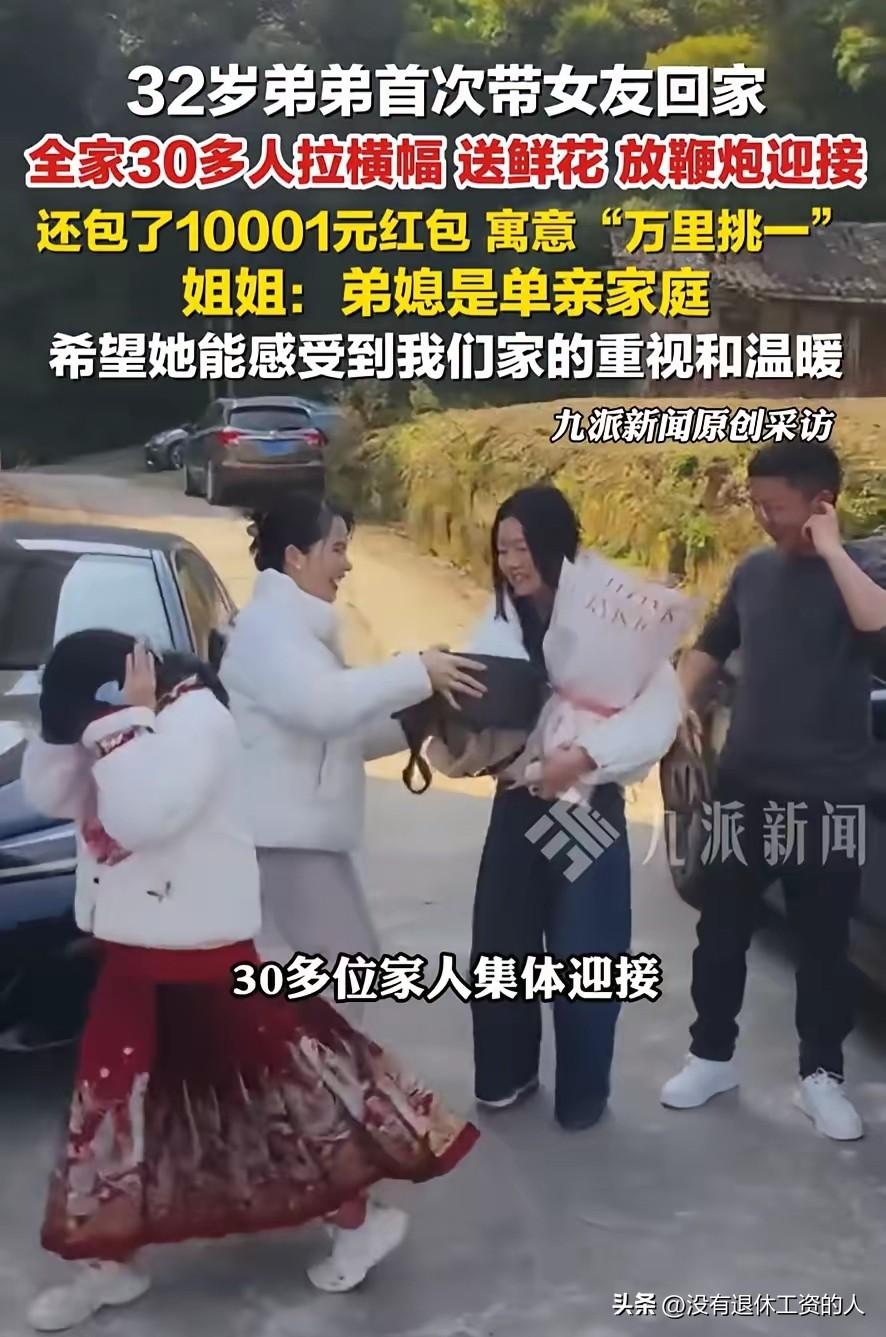 就这个阵势,别吓着姑娘。 四川南充,一名32岁的男子带女朋友第一次回家,没想到家里人迎接的太隆重了。 全家30多个人一起出门迎接,门口挂了横幅,还贴心的准备了10001元的大红包。 从女友下车开始,欢迎的鞭炮就响个不停。有人送上鲜花,有人递上礼盒,这仪式感拉满。 看得出来,全家人都欢迎女友的到来。 姐姐说:家里已经有十年没有人结婚了,这次必须热热闹闹的。女友是单亲家庭长大的,把见面仪式搞得隆重,也让女孩子感受家庭的幸福。 不得不说,一家人齐心协力,就会开开心心的,何况是女友第一次上门,更加的重视。 我想,这个姑娘遇到这家人也是幸福的,愿意给她花心思,愿意给她付出,这份心意足够了。 今后,就是一家人了,彼此尊重与付出,大家庭会越来越好的。 你们觉得是这样的吗? 南充对象