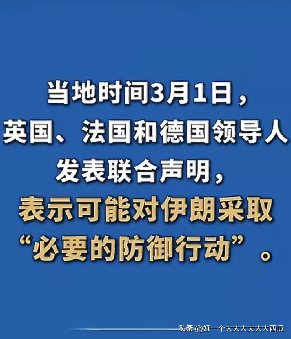 以美国为代表的西方真的太不要脸了, 美以第一轮的军事打击还没有结束, 这边英法德就开始匆匆表态了。 三国一起发表联合声明, 表示对伊朗采取“必要的防御行动”, 咋的,防御都跑到人家伊朗脸上去防御了? 明晃晃的侵略非要说成是防御, 就说这强盗的逻辑你服不服, 看来石油资源还是太香了, 强盗们都迫不及待上手了。