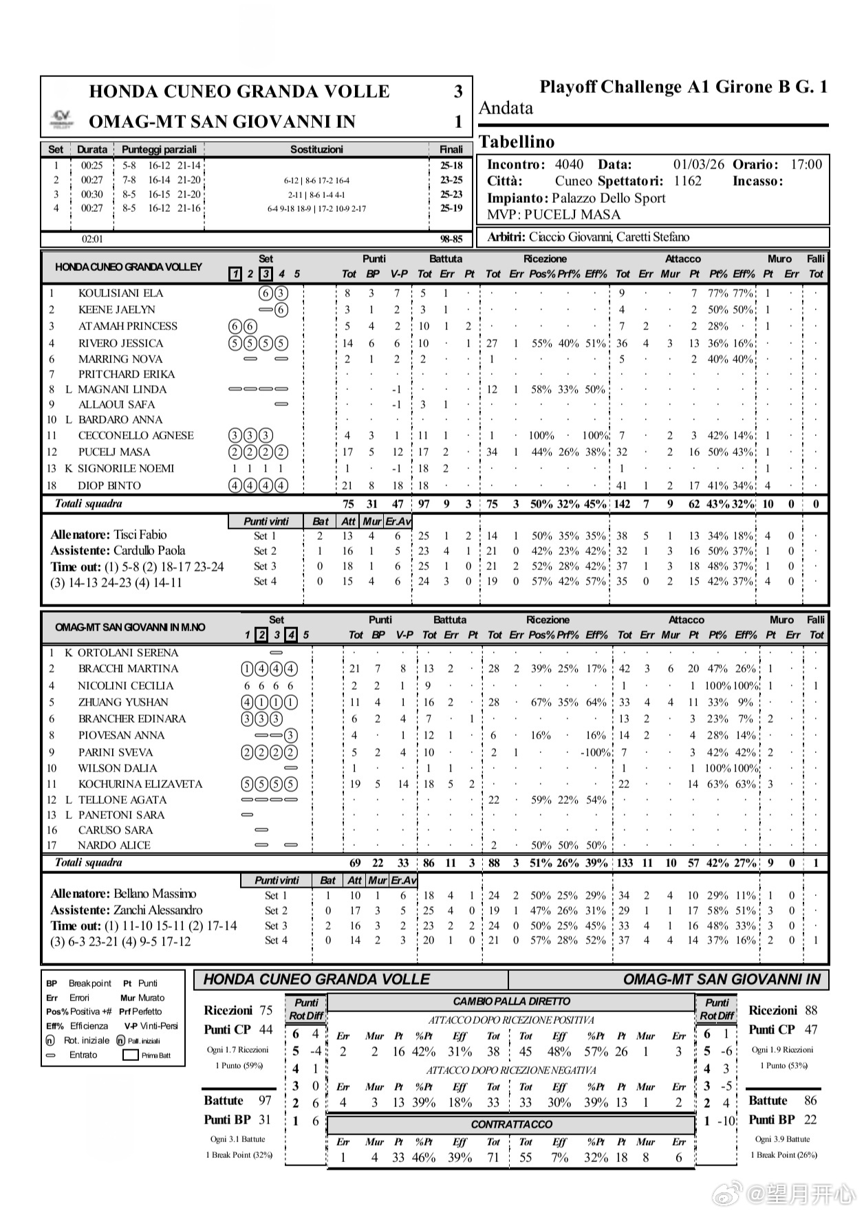 【欧挑杯资格赛,首场库内奥3-1圣乔瓦尼】意甲女排联赛欧挑杯资格赛,世界女排新闻庄宇珊留洋第一季庄宇珊 所在的圣乔瓦尼1-3不敌库内奥,四局比分18-25,25-23,23-25,19-25;庄宇珊11分(33扣11中4失误4被拦,28一传,一传到位67%)布拉齐21分,科楚丽娜19分
