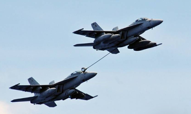 美国中央司令部发布部署东地中海的福特号参与“史诗怒吼”行动照片,可以看到有一架超级大黄蜂挂了4个大副油箱起飞的场面,没挂武器。 图4是以前美军展示的超级大黄蜂伙伴加油配置,4个大副油箱,腹部加油吊舱。