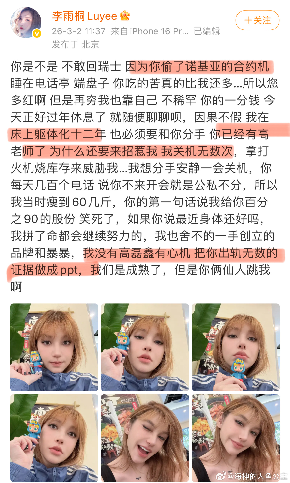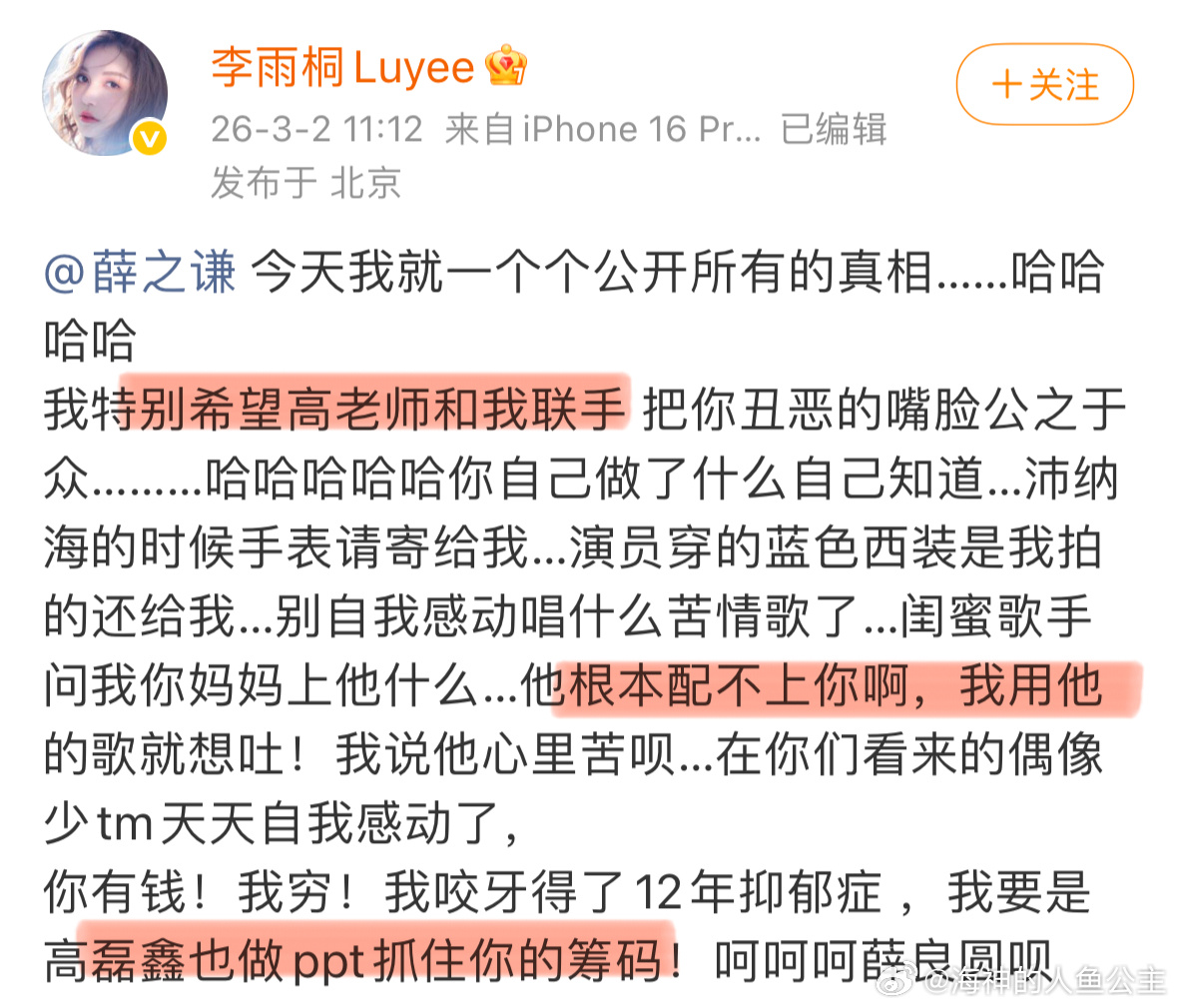 李雨桐喊话薛之谦 我勒个李雨桐以一己之力屠 榜 文娱rs神五,核心内容标记出来了1.希望高和她联手锤x2.开始搞抽奖抽签名照3.说x偷了诺基亚的合约机,自己躯体化12年,高把x出轨的证据做成了ppt???4.自己没留证据我:看不懂看不懂