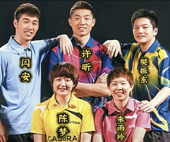樊振东、许昕、闫安、陈梦、朱雨玲同框合影留念的画面,多么美好的回忆,个个都笑容灿烂,一颦一笑都是最珍贵的回忆,满屏都是青涩与温柔。 当年并肩训练、赛场并肩的少年少女,如今各有光芒。这张合照是乒乓路上最治愈的相遇,时光不老,我们不散。