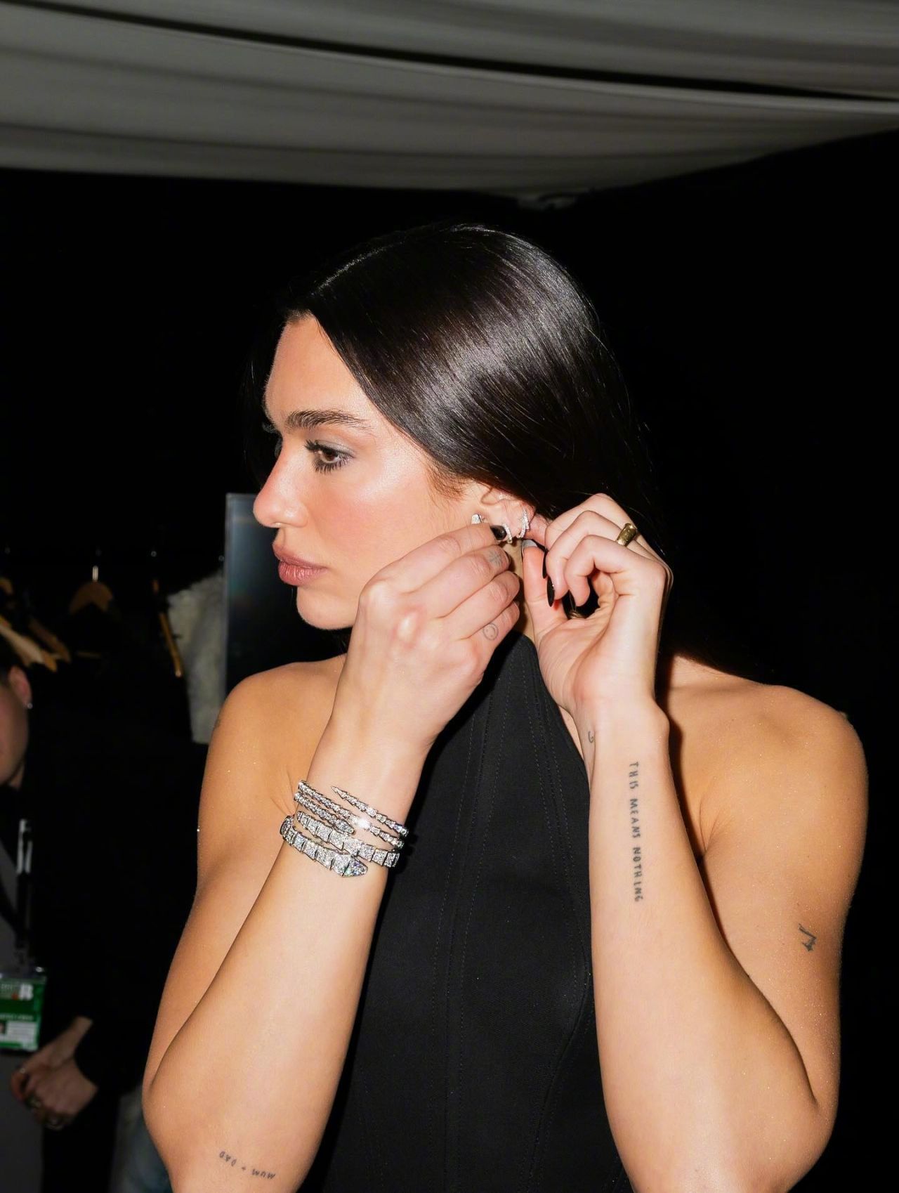 出席2026 年全英音乐奖颁奖典礼的杜阿·利帕 (Dua Lipa) ,身穿 Gucci 定制性感黑色深V露背连体衣,佩戴宝格丽高级珠宝系列白金钻石 Serpenti 项链和 Serpenti 蛇形戒指镶嵌钻石和祖母绿。整身造型充满活力又兼具性感的精致奢华。米拉服饰解析