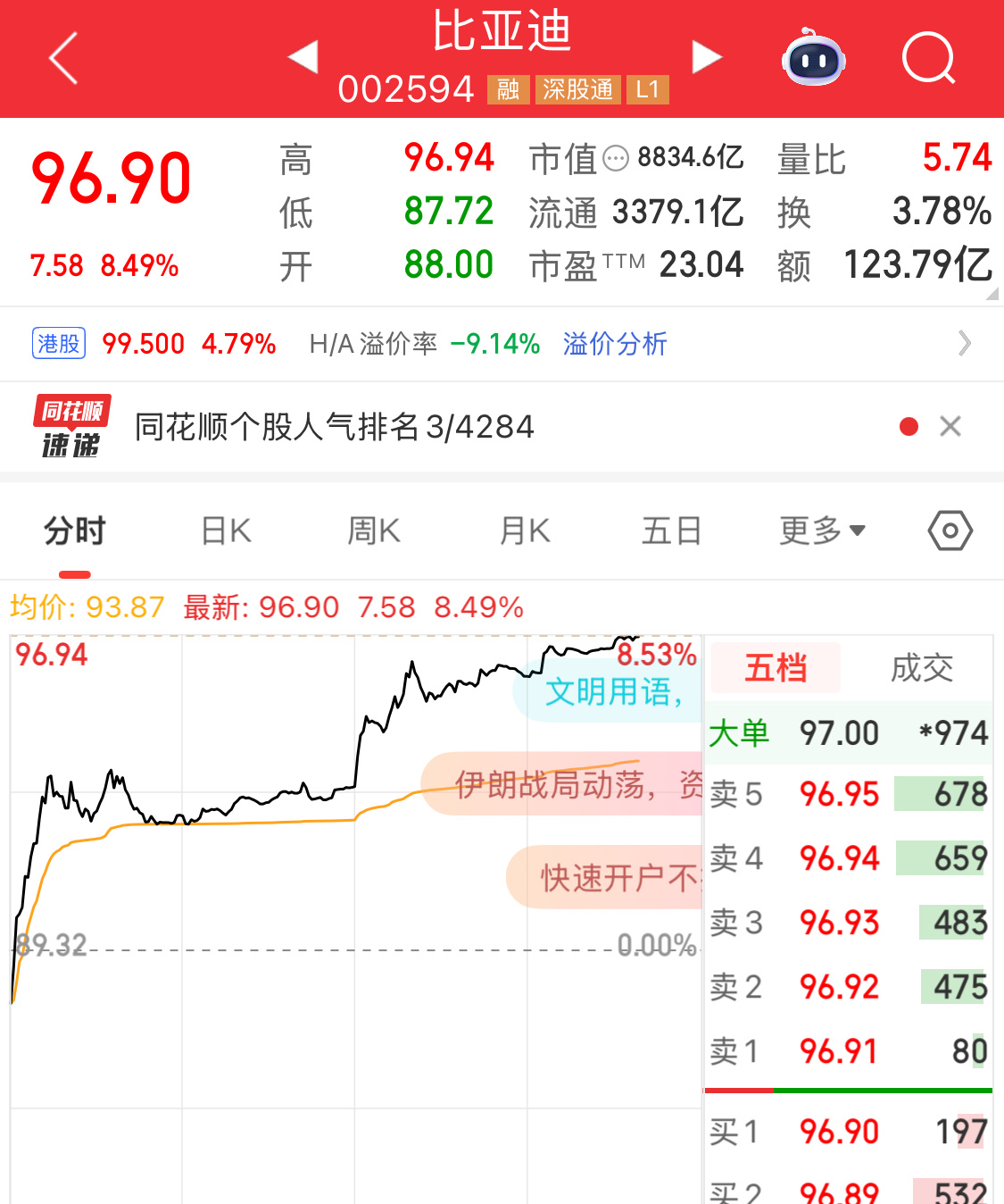 比亚迪什么情况?股票大涨,快触及涨停了。消息面来看,说是3月5号比亚迪发布颠覆性技术,去年好像也是这个时候,开年没多久就公布了多项重磅技术。最近,中东不太平,汽油价格剧烈波动,不知道比亚迪将要官宣的是否和新能源汽车电动化方面有关,只能说股市反应太快了,应该是听到了一些消息?比亚迪股票大涨7%