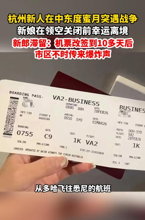 浙江杭州的一对90后新婚夫妇在过年期间去中东度蜜月,本来打算蜜月结束后去墨尔本的,结果却遇到了战争。妻子和丈夫迅速改签机票,但妻子和丈夫的飞机航班却隔了一天。在妻子先飞走后,当地领空突然被关闭,导致丈夫却被滞留在多哈。本来丈夫准备直接改签其他航班,但费用要3.5万元。无奈之下,丈夫只能选择免费改签至10日后的同一航班,但还不知道能否顺利。网友:为什么不能一起飞? 据悉,郑女士的丈夫虞先生在墨尔本工作,春节前二人在国内举行了婚礼仪式,并计划着陪父母过完年后,就去中东度蜜月,机票也提前订好了。 大年初三那天,夫妻二人就登上了飞往中东的飞机。期间,二人品尝了不少当地美食,也拍了不少风景和人物美照。 然而这份幸福与甜蜜并没有维持多久,在二人来到这次蜜月旅行的最后一站多哈时,战争突然爆发了。大家一下子陷入了恐慌,不少游客改签了机票。 郑女士和虞先生也立即改签机票,但因为积分兑换的限制,郑女士兑换到了2月28日上午9点从多哈飞往悉尼的机票,而虞先生则兑换了3月1日上午的同航班机票。 虽然不是同一航班,但虞先生认为战争应该没有那么快,隔一天也没什么问题,所以与郑女士在机场吻别后,他目送郑女士先行离开。 然而郑女士的飞机刚飞出领空后不久,战争就爆发了,领空直接关闭,3月1日的航班也直接被取消了。 虞先生本想改签当天其他时段的航班,但改签费用高达3.5万元,而改签其他航空公司的航班则非常麻烦。无奈之下,只得选择免费改签至3月13日的同航班。 也就是说,虞先生还得滞留在多哈10天,而这10天不知道会发展成什么样。 所幸妻子已经安全飞出去了,这让虞先生轻松不少。之后,虞先生买了一些饼干和水,然后回到了酒店,不敢踏出酒店,因为天空中有不少导弹在飞,他十分的担心。 与此同时,郑女士安全落地后,一直在担心着丈夫的安危,时不时地会询问丈夫安不安全,同时也关注着战争的走势。 对于郑女士和虞先生的遭遇,不少网友有点落井下石,称有钱人就是喜欢作,喜欢往外跑,这回出事了吧,活该。 但也有网友表示同情,人家只是不想在国内度蜜月时人挤人,而且有钱了有能力了去国外玩玩也没什么不错,谁能预料到战争会爆发?嘴上还是积点德吧。 对于这起事件,很多人不理解为何积分兑换的机票就会有那么多限制,难道积分不是一次次的乘坐飞机所积累起来的吗?这些有钱人难道就不能享受下特殊待遇? 积分机票,是航空公司推出的一款可以使用飞行里程或合作联盟积分兑换机票的活动,通常仅限持卡人及其亲属使用。 能用积分兑换机票,这一般都是经常乘坐飞机的人,否则也没那么多积分来兑换。 郑女士和虞先生在兑换多哈前往悉尼的飞机时,是兑换的商务舱,而商务舱的位置是有限的。 不仅如此,当时还有其他人得知战争要爆发,都扎堆地在那兑换机票,所以错开也是十分正常的。 那为什么飞机改签的费用那么高?这是否合理呢? 其实机票的价格是实时浮动,并非一直不变的。 如果旅客频繁改签,会影响航班座位的稳定性,有可能造成座位空置的情况,这属于资源浪费,还影响二次销售或者增加相应的运营成本。 目前来说,飞机的退改费用,一般是由退票费或改期手续费+新旧机票的差价计算出来的。 《价格法》第11条规定,经营者进行价格活动,享有下列权利: (一)自主制定属于市场调节的价格; (二)在政府指导价规定的幅度内制定价格; (三)制定属于政府指导价、政府定价产品范围内的新产品的试销价格,特定产品除外; 由此可见,航空公司享有自主定价的权利,那么关于机票的退改签的费用问题,航空公司也享有指定规则的权利。 不过,航空公司作为经营者不能侵犯消费者的合法权益。 也就是说,航空公司应当就自行制定的退改签规则,向消费者进行明示,要让消费者知道具体的规则,否则就侵犯了消费者的知情权。 对于此事,您怎么看?欢迎留言交流。