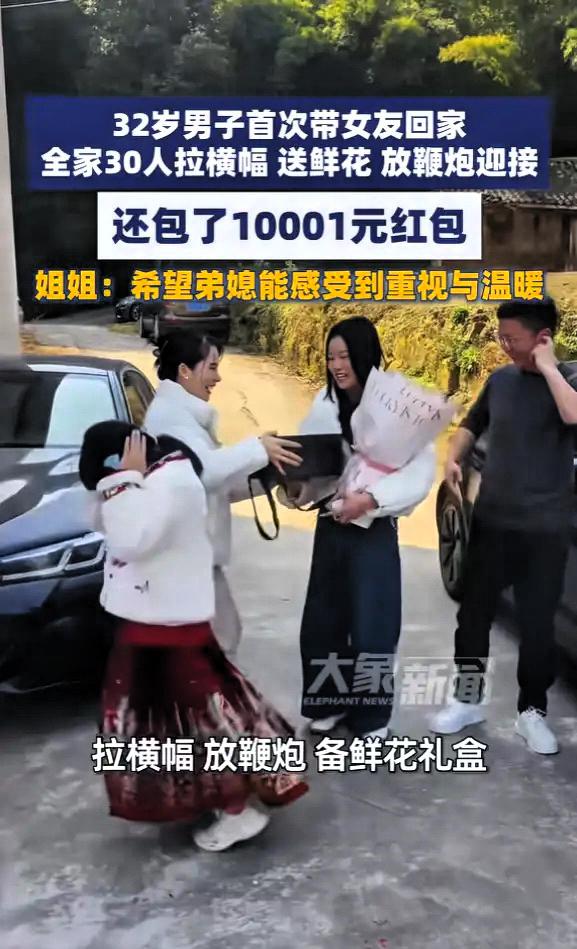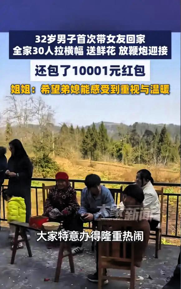 羡慕了!四川南充,一男子第一次带女朋友回家,为了表达重视,全家提前一个月筹备,30多位家人集体迎接,办了一个十分隆重的欢迎仪式,还包了10001元的红包,寓意“万里挑一”,希望女生能感受到重视!网友:羡慕哭了! 这件事发生在3月1日,四川南充一个普通的家庭里。男生今年32岁,家里已经快十年没有年轻人结婚了,这次终于把女朋友带回家,全家人都激动坏了。 姐姐说,女孩是单亲家庭长大的,家人特意商量,一定要办得热热闹闹,让她一进门就感受到被捧在手心里的温暖。 提前一个月,家族群就炸了锅,大家分工明确:有人定制“欢迎未来弟媳”的横幅,有人准备鲜花礼盒,长辈们把房间收拾一新,连床单被罩都是全新的。 知道女孩怕狗,家里的小狗都提前安顿好,就怕吓着她。 当天,30多位亲戚早早在村口等着,车一到,鞭炮响起、鲜花递上,女孩一下车就懵了,又惊喜又害羞,眼圈当场就红了。 婆婆立刻把10001元红包塞到她手里,没有半点虚礼,全是实打实的认可。 红包是心意,排场是态度,最难得的是全家都把你放在心上。 好的家风从不是钱多钱少,而是一家人愿意为你用心、给你底气、护你情绪。 被这样重视的女孩,往后一定很幸福。