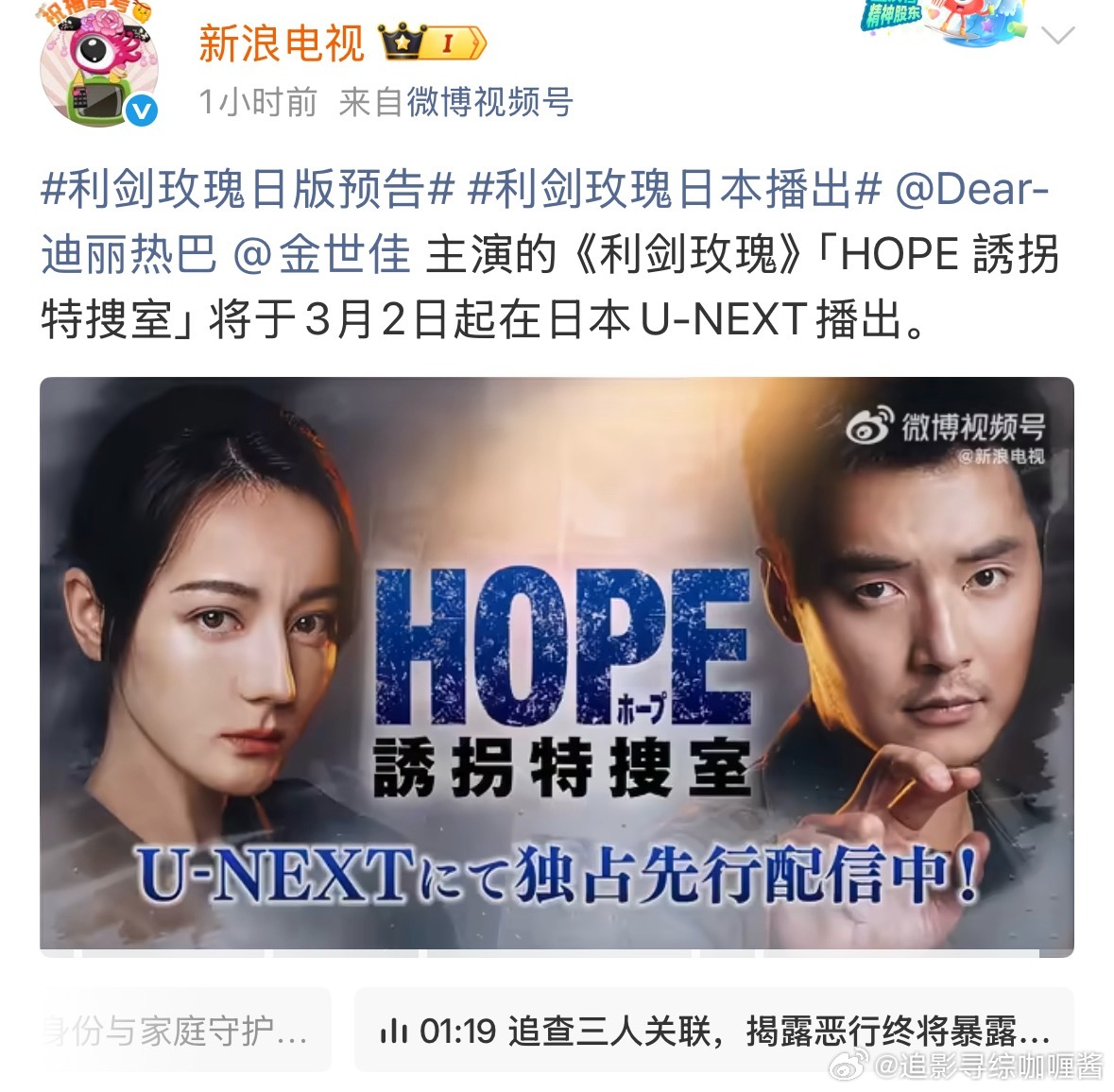 迪丽热巴金世佳《利剑玫瑰》3.2日将在日本播出日文名「HOPE 誘拐特捜室」太中二太霓虹了