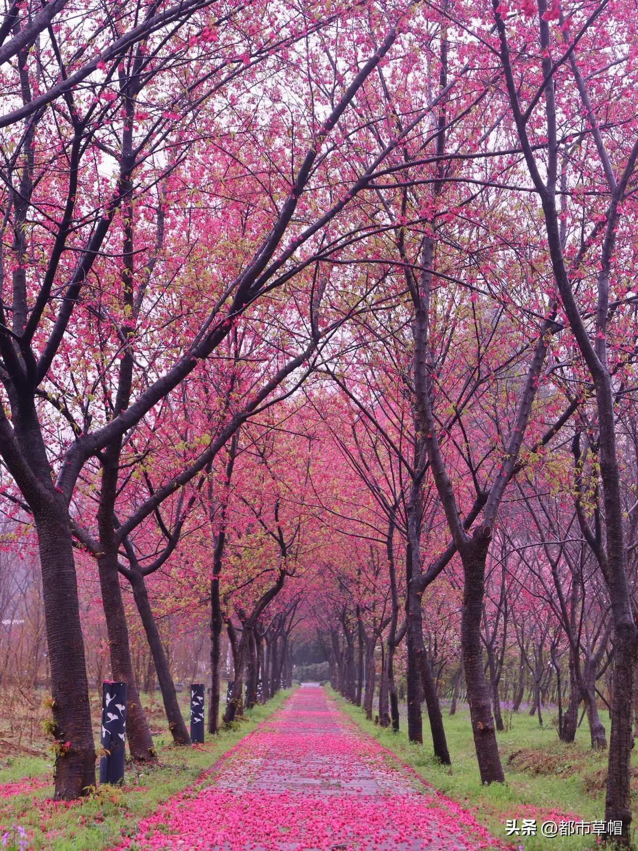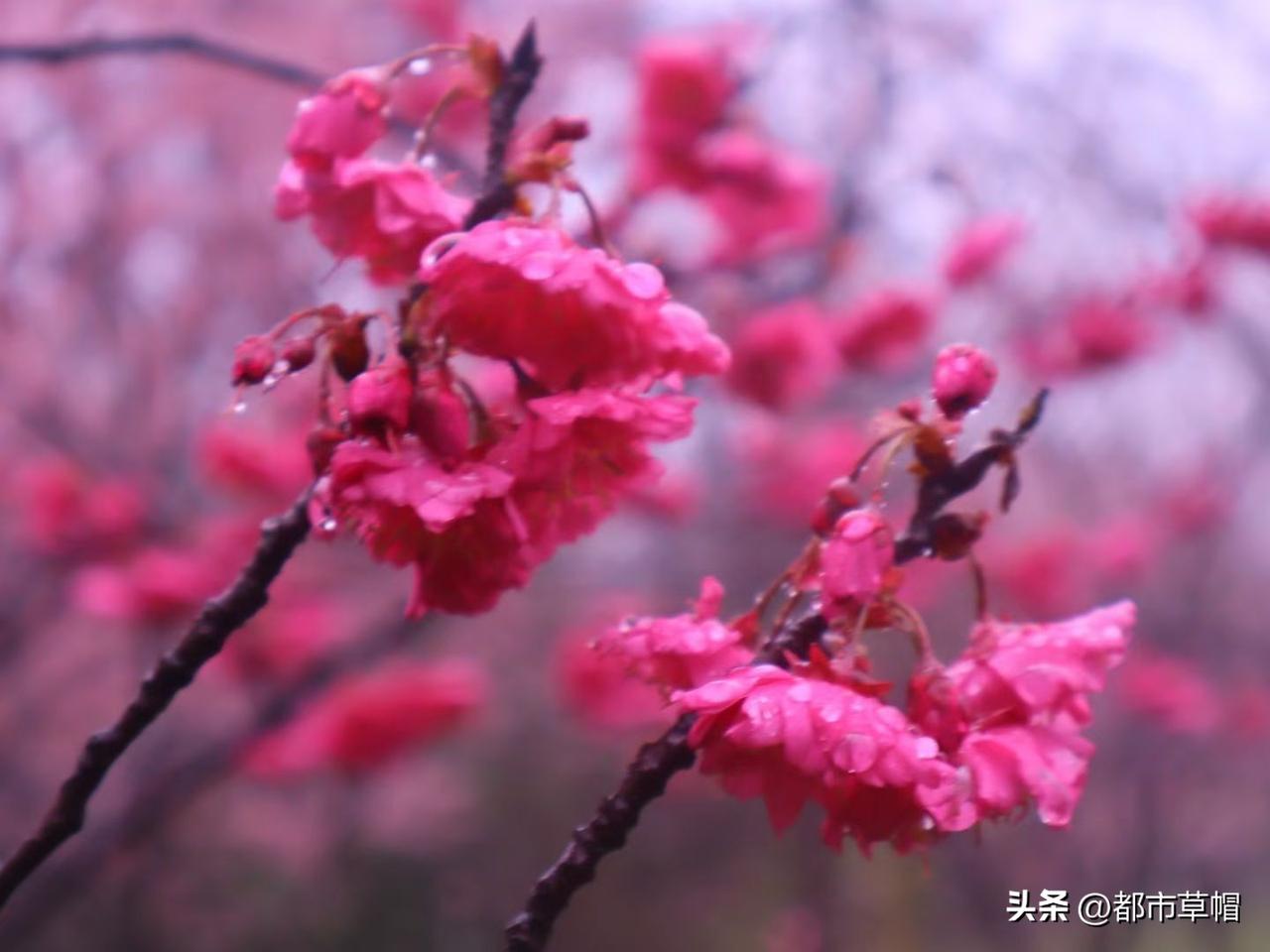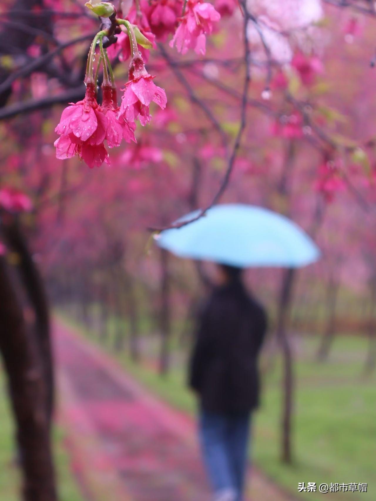一阵风, 吹开了一树花。 一阵雨, 让花瓣纷纷落下。 撑一把伞, 你在春雨和花雨中徜徉。 花和雨连在一起, 让人想起梨花带雨的娇柔。 雨中娇艳欲滴的樱花, 是不是也勾起了你的似水柔情? 怎么会有这么高大的樱花树? 怎么会有开得这么早的樱花?