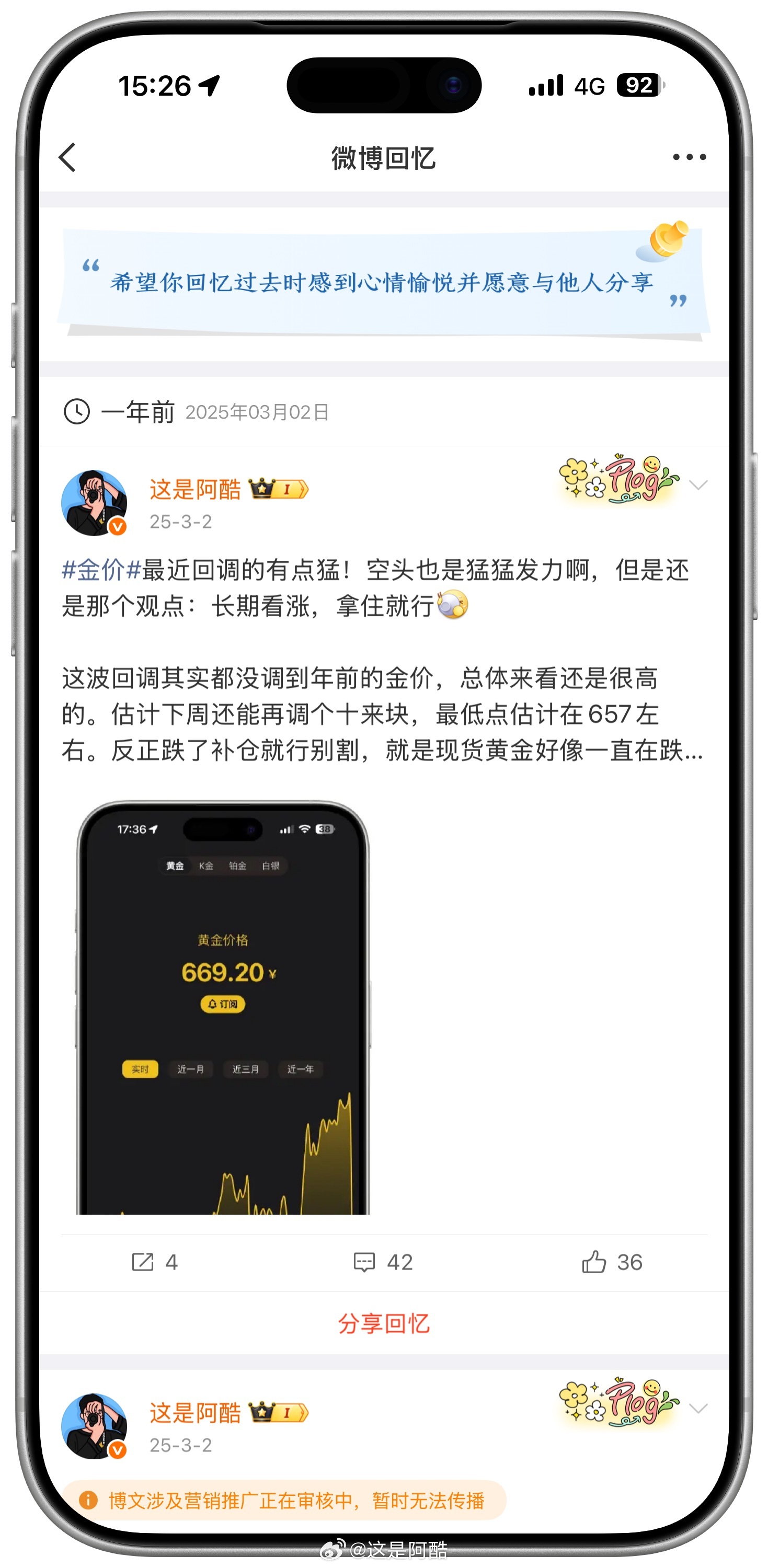 一年前的今天金价669而现在今天的金价1197