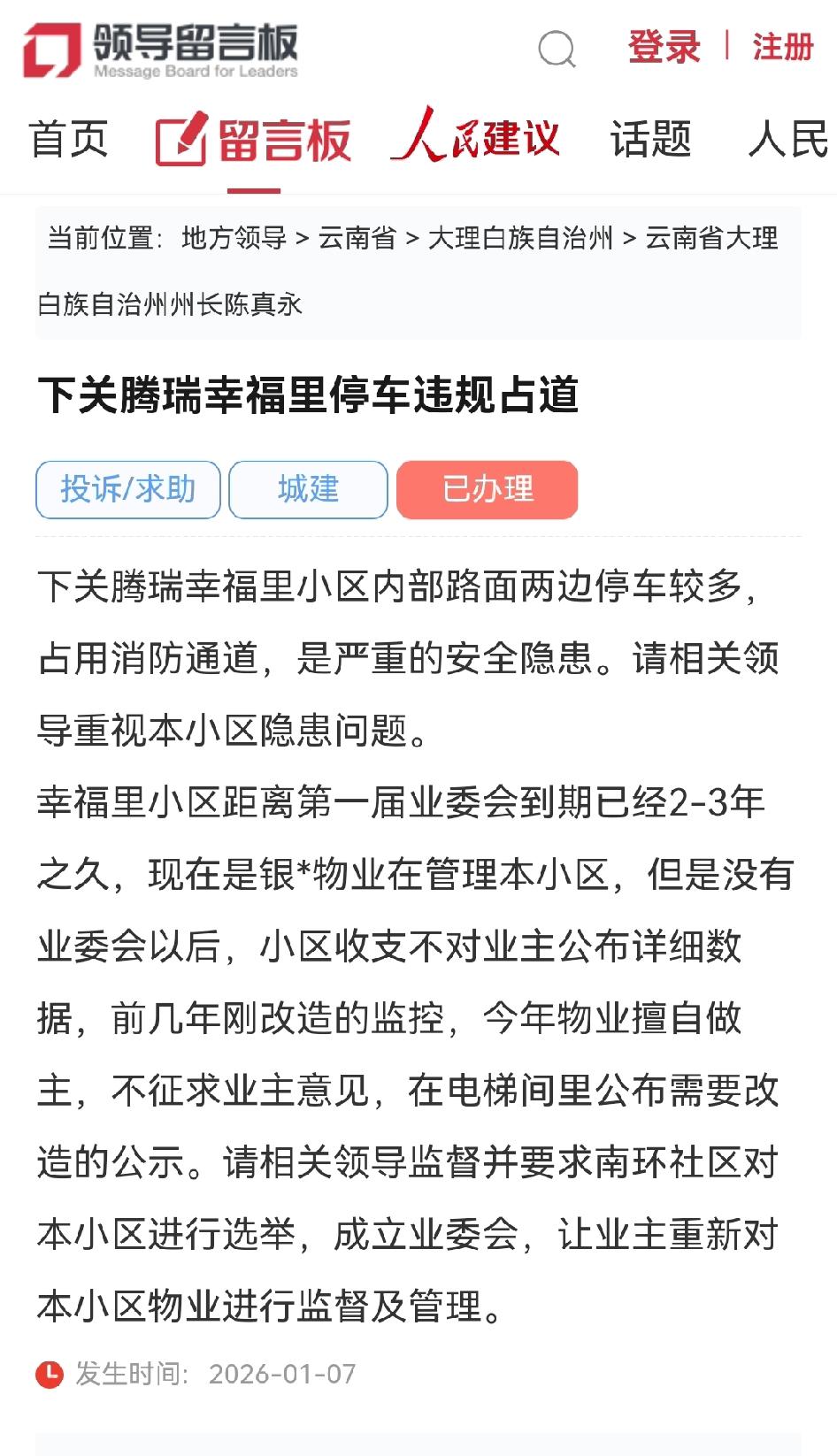 大理网民向州长反映“下关腾瑞幸福里停车违规占道”的问题 近日大理网民通过人民网领导留言板给大理州州长的留言: ✍📩下关腾瑞幸福里停车违规占道 下关腾瑞幸福里小区内部路面两边停车较多,占用消防通道,是严重的安全隐患。请相关领导重视本小区隐患问题。 幸福里小区距离第一届业委会到期已经2-3年之久,现在是银*物业在管理本小区,但是没有业委会以后,小区收支不对业主公布详细数据,前几年刚改造的监控,今年物业擅自做主,不征求业主意见,在电梯间里公布需要改造的公示。请相关领导监督并要求南环社区对本小区进行选举,成立业委会,让业主重新对本小区物业进行监督及管理。 发生时间: 2026-01-07 📢📩官方回复:2026-01-30 19:01 大理市住房和城乡建设局,大理市人民政府下关街道办事处 网民同志:您好! 您通过人民网领导留言板给大理州州长的留言收悉,我们高度重视,第一时间转送相关部门开展调查核实,现将有关情况回复如下: 关于您反映“下关腾瑞幸福里停车违规占道”的问题。经大理市住房和城乡建设局核实,我局住房保障和房地产管理科工作人员于2025年12月12日到腾瑞幸福里小区进行现场调研座谈。 腾瑞幸福里于2015年交付,小区共有3100户,地下车位1105个,车位配比1:0.3,小区车位配比严重不足。物业公司以消防通道进行了横幅悬挂宣传、定期推送温馨提示、每日张贴告知书等方式,对不规范停车的业主采取了劝告,但由于小区业主日常生活需求,停车占用消防通道造成了小区消防通道堵塞,问题难以彻底解决。对此问题,物业公司已多次与开发公司联系,但开发公司一直坚持车位只售不租。 2017年至今,大理市消防救援大队也已多次到现场进行检查,并督促物业公司整改安全隐患问题。作为物业行业管理部门,我局座谈时已再次督促物业公司进一步强化日常管理,并要求物业公司再次联系开发公司协商地下车库开放临停车位事宜,对回家较晚的业主另行安排区域停放,对长期违停的业主进行重点劝告。 另外,物业公司代业主管理的小区公共收益的收入、支出情况,物业公司每年都按要求进行了公示公告,按照要求于每年第一季度的3月30日前在小区公示栏或物业服务中心等位置进行公示,业主也可以到物业服务中心查阅了解。物业公司的物业费等收支情况无规定必须进行公开。 由于召开业主大会困难,物业公司使用公共收益前必须征求业主的意见,我局已督促银X物业开设公共收益专户,对小区公共收益进行专户存储、单独列账进行管理。按照物业管理活动监督检查的相关要求,我局对辖区部分小区公共收益管理情况实行“双随机”抽查,对发现的问题下发整改通知要求进行整改。建议您与物业多沟通,支持和监督物业对小区的规范化管理,共建和谐幸福生活小区。 关于您反映“幸福里小区业委会成立”的问题,大理市人民政府下关街道办事处核实,幸福里小区于2019年8月选举成立首届业委会并备案,2022年8月业委会任期满后,街道和社区均未收到业委会换届相关工作信息,小区部分业主以个人名义到社区诉求换届等事宜,但都未按正规换届程序依法提请相关资料。根据《物业管理条例》第十一条和《云南省物业管理规定》第十四条规定:选举业主委员会或者更换业主委员会成员事项由业主共同决定。 您反映要求南环社区主导成立业委会不符合法定程序,且社区无此权限。建议小区业委会尽快依法依规向所属社区对接相关换届工作,由社区指导、监督小区成立新的换届机构,互相配合做好业委会换届工作。 感谢您对我们工作的理解与支持,祝您身体健康,生活愉快!
