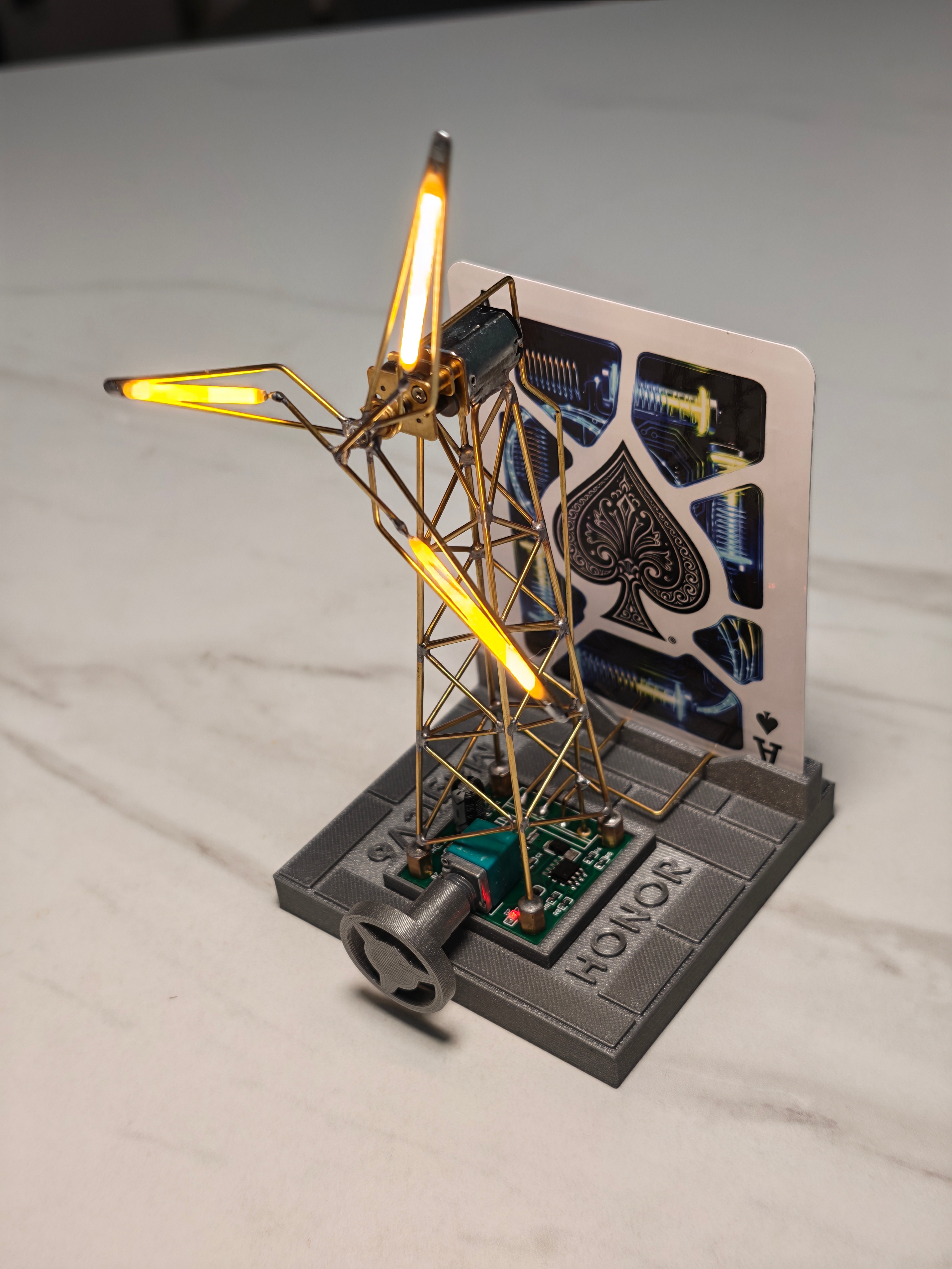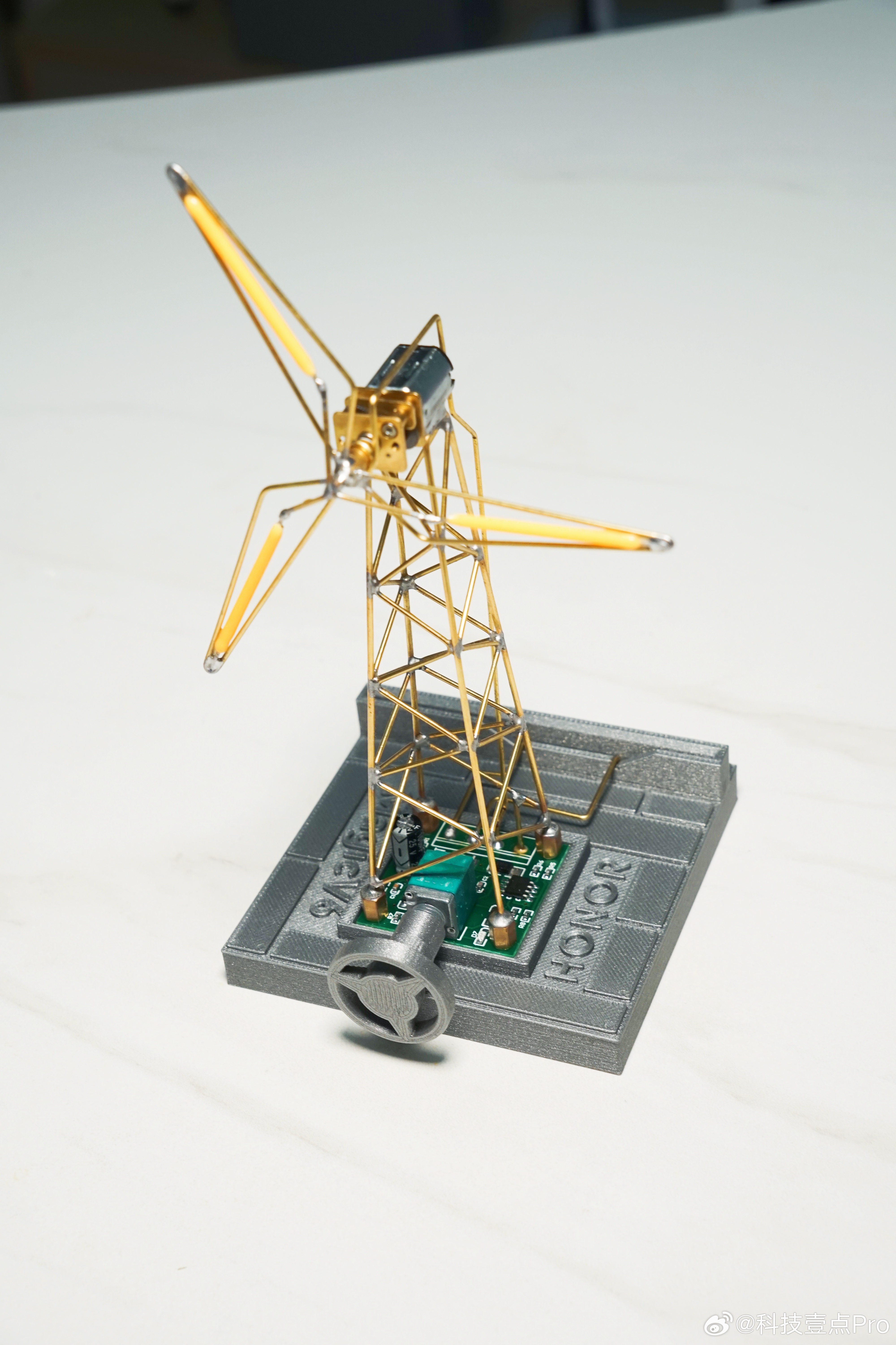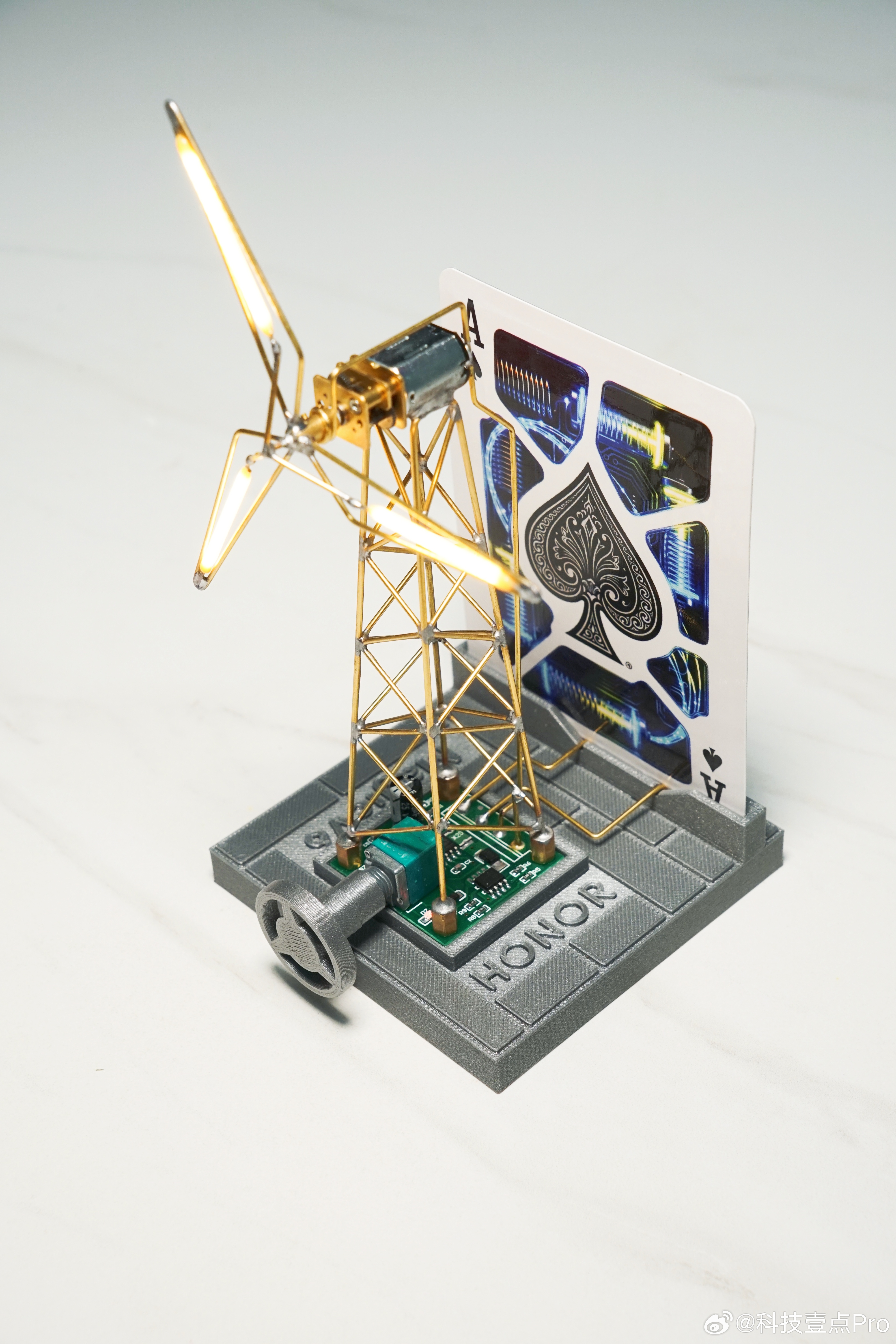 然后,今天又收到了荣耀寄来的一个快递,打开一看是一个风车道具(图二),我研究了一下发现这玩意没电池驱动呀,说时迟那时快,一下子想起了昨天的扑克牌是不是暗藏玄机,然后仔细翻了翻扑克牌,结果发现第一张扑克牌的背面集成了一块电池