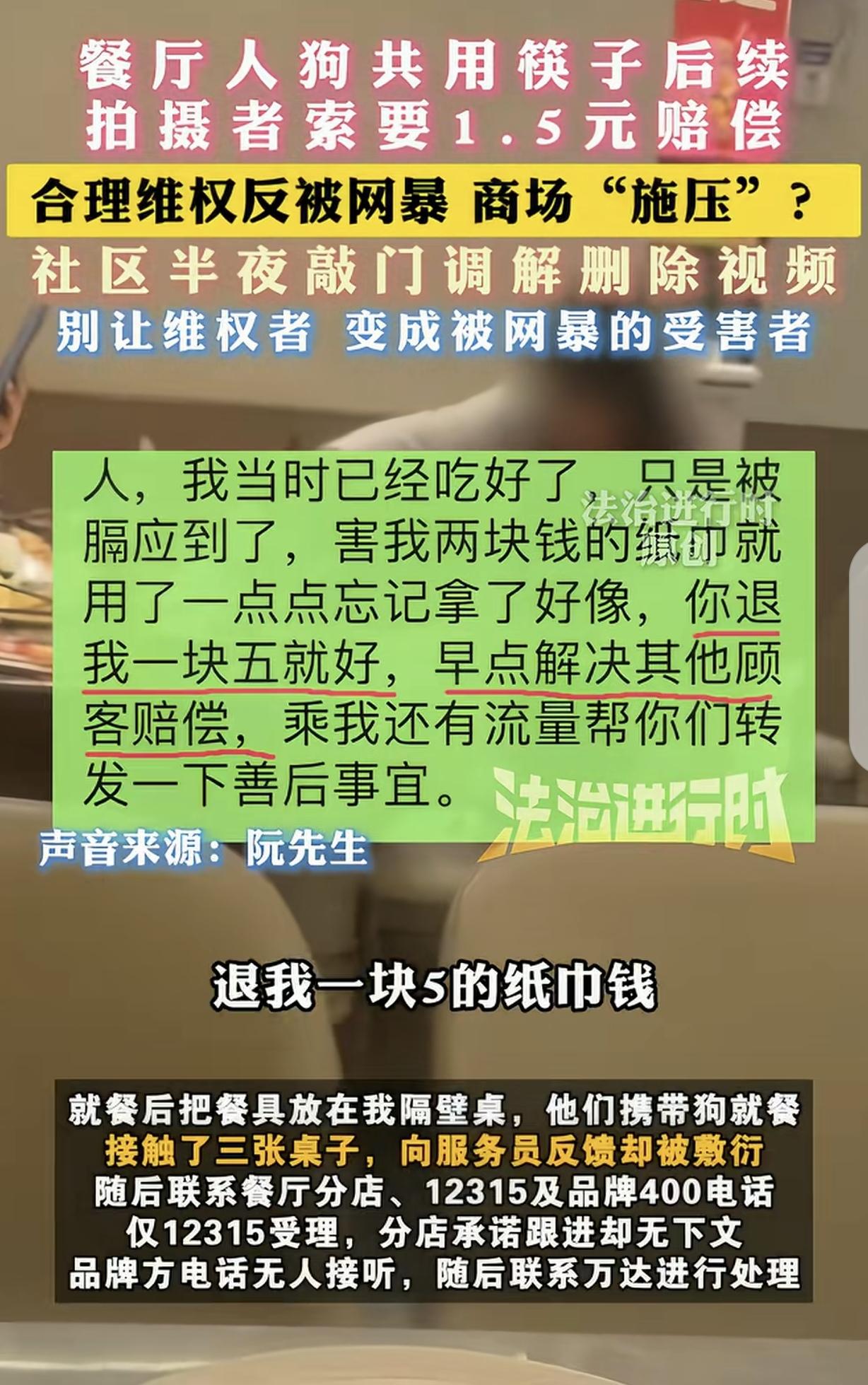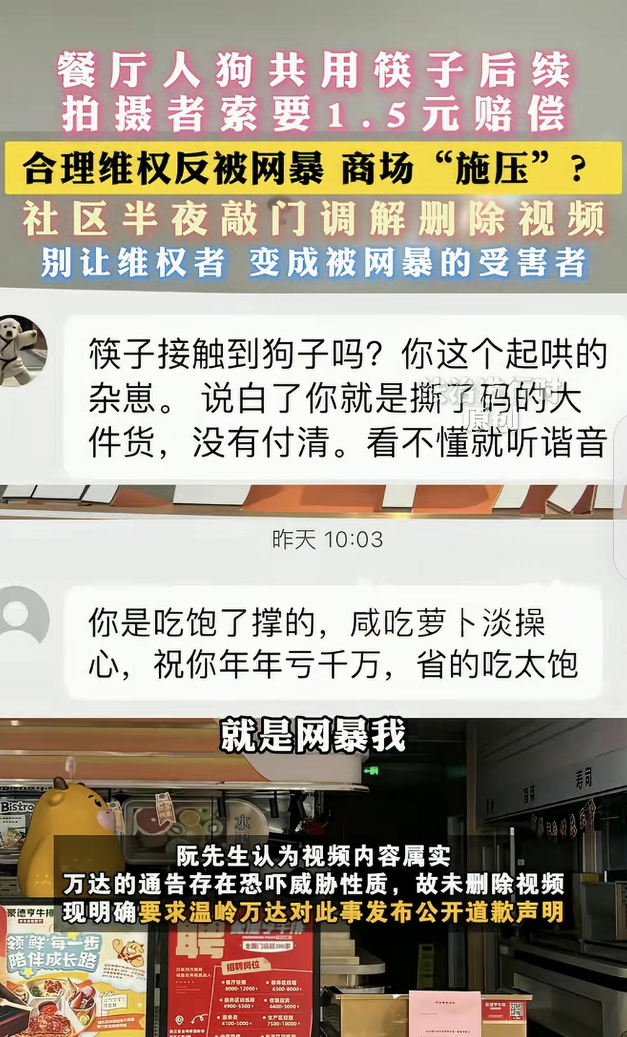 “吃饱了闲的?”浙江台州,一男子带孩子下馆子,发现一女子带着宠物狗就餐,接触了3张桌子,然后用筷子给狗喂食物,男子被恶心到了,他跟服务员投诉,人家很是敷衍,他又跟餐厅分店,12315,还有品牌400投诉,只有12315受理了,分店没下文,品牌方不接电话,他拍下视频赶紧离开,因为走的急,2元的餐巾纸忘带走,他要求餐厅退他1.5元的餐巾纸钱,再给其他就餐的顾客赔偿,被拒后,男子曝光了这件事,视频一下火了,商场,餐厅还有品牌方才联系他,正在男子准备删除视频时,商场却发通告,说男子恶意诋毁,保留起诉他的权利,而且,社 区半夜11点敲门问情况,男子和家人一夜都没睡好,还有爱宠人士发信息骂他,男子崩溃了:我哪里错了?凭啥这么对我? 当时,他正陪着孩子用餐,就看见一家三口带着一只小型宠物狗,堂而皇之地走进了餐厅。这家人一点都不讲究,先是把狗放在阮先生孩子同排的沙发椅上,狗在椅子上抖了抖身子,他们又换了个桌子,坐到了阮先生身后。 更过分的是,女子直接拿起自己吃饭的筷子,夹起盘子里的食物,喂给怀里的狗吃,期间筷子还掉过一次,捡起来又继续喂,全程没觉得有任何不妥。 这只狗前后接触了3张餐桌,想想这些桌子后续还要供其他顾客使用,阮先生心里一阵恶心,尤其是身边还有孩子,他更担心卫生问题。 阮先生实在忍不了,就找了餐厅服务员投诉,跟服务员说有人带狗进店,还用餐厅的筷子喂狗,太不卫生了。可服务员压根不当回事,敷衍两句就转身走了,连去看看的意思都没有。 阮先生没气馁,又接着找餐厅分店投诉,打品牌客服电话,还拨通了投诉热线。可结果让他寒心,餐厅分店那边石沉大海,没有任何下文。 看着眼前的场景,阮先生越想越气,就用手机拍下了女子喂狗的视频,怕再发生争执,也怕影响孩子,他拍好视频就赶紧带着孩子离开了餐厅。 走得太急,他忘了带走餐厅收费2元的餐巾纸,事后他联系餐厅,要求退1.5元的餐巾纸钱,毕竟纸巾没用到,同时也要求餐厅给当天其他就餐的顾客赔偿,毕竟大家都可能接触到被狗碰过的餐桌和餐具,存在卫生隐患。 可他的这个合理要求,直接被餐厅拒绝了。 投诉无门,合理要求又被拒,阮先生实在咽不下这口气,就把拍的视频发到了网上。没想到视频一发出去就火了,全网都在讨论这件事,指责女子没公德心、餐厅管理不到位。 这时候,之前不管不问的温岭万达商场、涉事餐厅,还有豪德亨品牌方,才主动联系阮先生,态度也变得客气起来,商量着让他删除视频,承诺会妥善处理此事。 阮先生本来也不想把事情闹大,只要能解决问题,给大家一个交代,他就同意删除视频,甚至已经做好了删除的准备。 可谁能想到,就在这个时候,温岭万达商场突然发布了一则通告,里面竟然说阮先生发布视频是恶意诋毁,还说要保留起诉他的权利。 这一下,阮先生彻底懵了,他明明是受害者,好心投诉卫生问题,曝光不文明行为,怎么就成了恶意诋毁? 更让他崩溃的是,当天半夜11点,社区工作人员突然上门敲门,询问这件事的来龙去脉,折腾了大半夜,他和家人一夜都没睡好,家里的老人也跟着忧心忡忡。 除此之外,还有一些爱宠人士,不分青红皂白就发私信骂他,说他没事找事、欺负小动物,把所有的过错都推到他身上。 这些谩骂、商场的倒打一耙、社区半夜的打扰,压得阮先生喘不过气来,他忍不住崩溃质问:我哪里错了?凭啥这么对我? 其实明眼人都能看出来,阮先生从头到尾都没做错。他只是想在干净卫生的环境里带孩子吃顿饭,看到不文明、不卫生的行为,主动投诉,是在维护自己和其他顾客的合法权益。 女子带狗进餐厅,还用筷子喂狗,餐厅没有尽到管理责任,服务员敷衍了事,分店和品牌方视而不见,这些才是问题的关键。 事发后,涉事餐厅说,监控显示女子没有用筷子直接接触狗嘴,只是把食物放在纸巾上喂狗,还说已经把店里所有的筷子都销毁了,重新买了新的。 可不管筷子有没有直接接触狗,宠物狗进入餐饮场所本身就是违规的,餐厅前期的敷衍和管理缺位,是不争的事实。 温岭万达商场说自己是宠物友好型商场,但宠物友好不是无底线,不能允许宠物进入餐厅这种直接接触食物的场所,更不能在出了问题后,不解决问题,反而先解决发现问题的人。 目前,温岭市城东市场监督管理所已经介入调查,豪德亨品牌也明确表示,以后禁止宠物进店。可阮先生受到的困扰,却没人来买单。他只是做了一件大多数人都会做的事,却被网暴、被指责、被打扰,换做是谁,都会崩溃。 说到底,这件事的核心,就是部分人缺乏公共公德心,商家缺乏责任担当,商场公关拎不清。养宠物是个人自由,但不能凌驾于公共利益之上;商家要赚钱,但不能忽视食品安全和顾客权益;商场要打造宠物友好形象,但不能没有底线。
