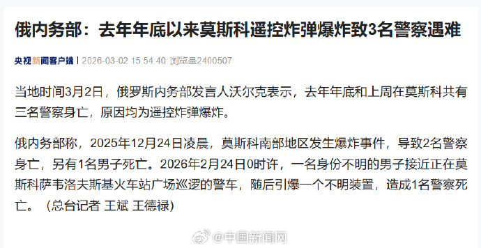 【莫斯科遭炸弹袭击】莫斯科遭袭3名警察遇难 3月2日,俄罗斯内务部通报,莫斯科近期发生两起针对执法人员的遥控炸弹袭击,共造成3名警察遇难。其中,2025年12月24日,莫斯科南部发生爆炸致2名交警身亡;2026年2月24日,萨韦洛夫斯基火车站广场发生爆炸致1名警察死亡。俄方称袭击由受乌克兰方面影响的人员实施,目前正全力追查幕后组织者。
