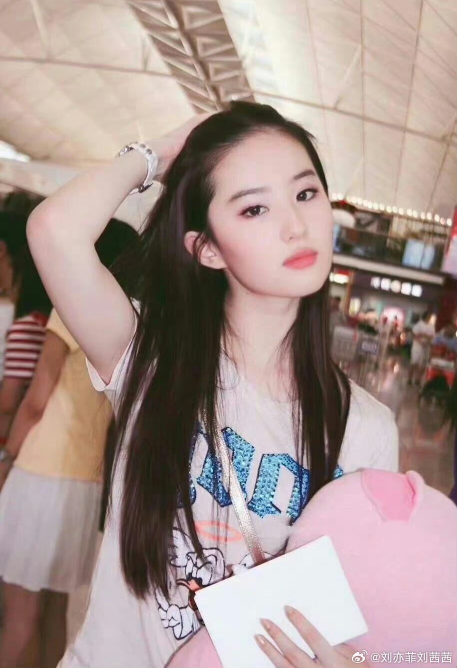 身处机场候机大厅的她,背景是来来往往的旅客和机场设施,日常出行的场景却因她的出现而变得格外引人注目。