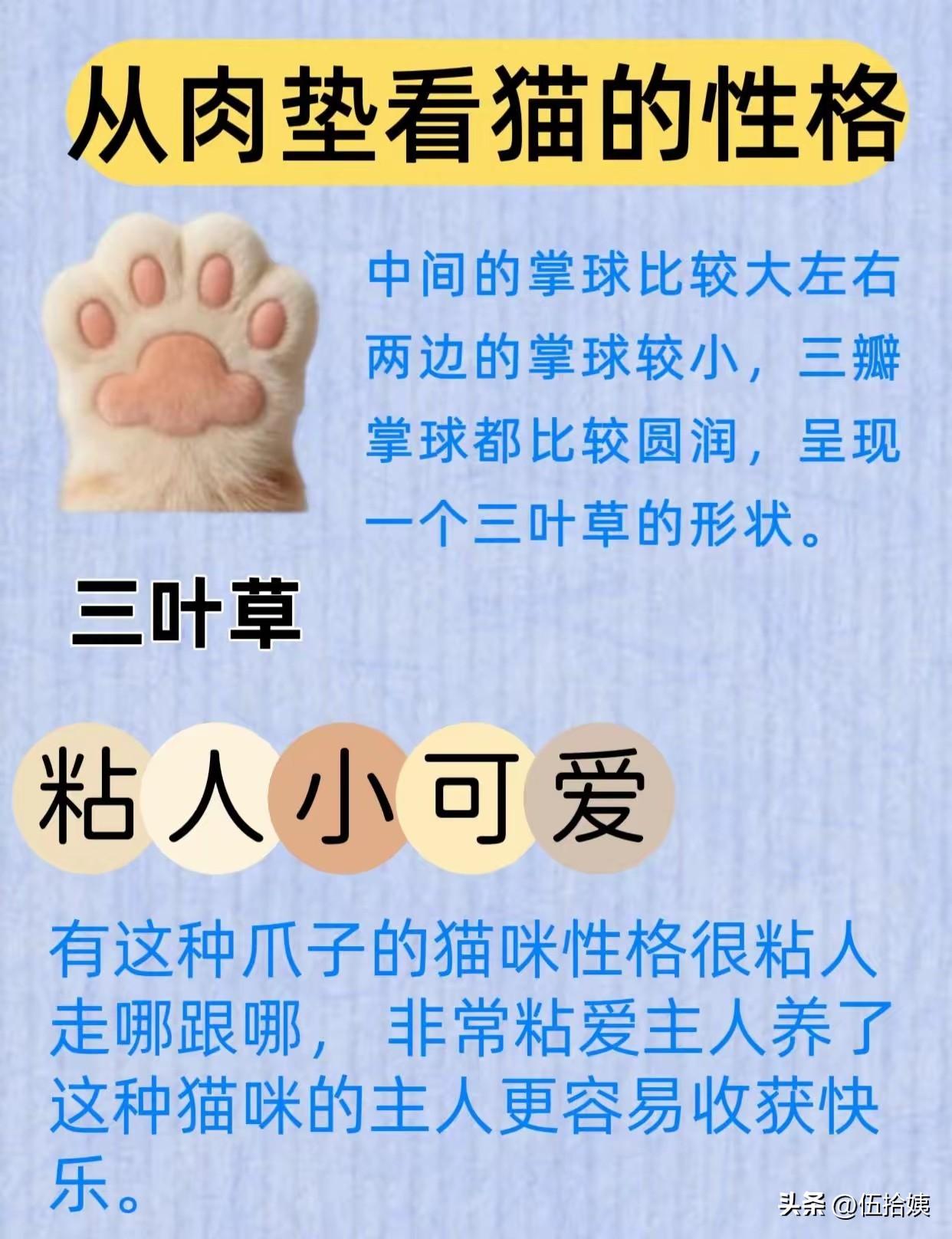 我家毛孩子的脚掌,应该是三叶草型吧?(以前一直以为猫掌都是一样的)[笑哭] 三叶草型,性格超级像,粘人! 真的走哪儿跟哪儿,你做饭,它在厨房;你洗澡,它在卫生间;你睡觉,它在卧室! 有时候看见它睡的正香,去阳台晾衣服,等你晾了两件回头一看,它早就尾随而来,蹲坐在不远的地方[黑线] 快看看你家毛孩子是什么形状的,性格像不像?[呲牙]