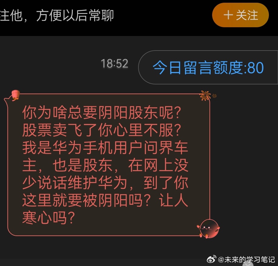 华为手机、问界车我哪个也不少,叠甲对我没有用。我不是股东,我能做到自始至终对品牌保持足够的,客观的发展信心。我能支持鸿蒙智行5年,和股票无关,你说你是股东,你能吗?