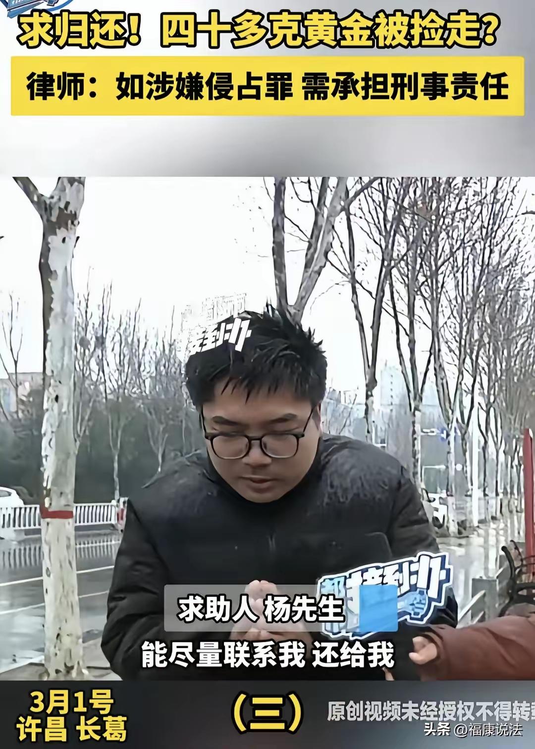 这件事确实令人揪心,也折射出了社会伦理与法律的交织问题。杨先生一家的遭遇非常不幸,丢失的黄金不仅有不小的价值,更承载着他们救治父亲的希望和家庭的脆弱情感。看到杨先生在镜头前双手合十、几乎哀求找回黄金,着实让人动容。 从法律角度来看,拾得遗失物应当及时返还权利人,否则可能触犯侵占罪。《民法典》第314条明确规定拾得人应当返还或者交给相关部门,拒不归还是违法行为。监控录像有力地固定了捡拾人的行为证据,警方正在通过人脸识别等方式查找,法律手段有望促使黄金归还。 但更深层次,这也凸显了拾金不昧、道德自觉的重要性。对那对母子来说,这几十克黄金不是普通财物,而是一个家庭的“救命钱”,若选择归还,不仅合乎法律,更体现了人性的光辉和社会责任感。 理解杨先生的焦虑和自责,也呼吁公众给予支持和关注。希望这对母子能够被良知感召,自觉归还遗失物,帮助一个身陷困境的家庭渡过难关。这件事也提醒大家日常生活中细心保管贵重物品,避免类似悲剧发生。 你怎么看?或者你有什么想帮助杨先生小家的建议吗?情感道德困境 社会伦理悲剧