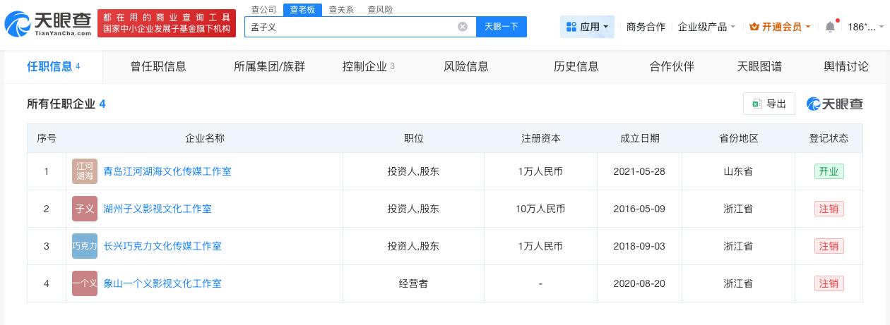 孟子义名下关联4家企业 孟子义名下多家企业已注销孟子义自曝两年最长只休了2天 据报道,3月1日晚,孟子义在直播时自曝这两年自己最长一次休息只休了2天,引发热议。 天眼查App显示,孟子义共关联4家企业,其中1家为开业状态,为青岛江河湖海文化传媒工作室,其余3家企业已注销。孟子义在上述企业中担任投资人等职务,版图涉及文化传媒领域。 天眼查信息:-c2961354384