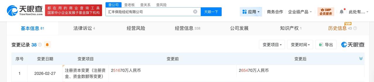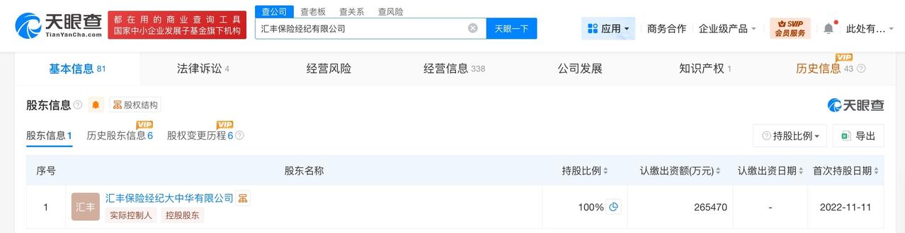 汇丰保险经纪公司增资至约26.5亿 天眼查工商信息显示,近日,汇丰保险经纪有限公司发生工商变更,注册资本由约25.17亿人民币增至约26.5亿人民币。 该公司成立于2012年4月,法定代表人为周莉莉,经营范围为保险经纪业务、公募证券投资基金销售。股东信息显示,该公司由汇丰保险经纪大中华有限公司全资持股。 天眼查信息: