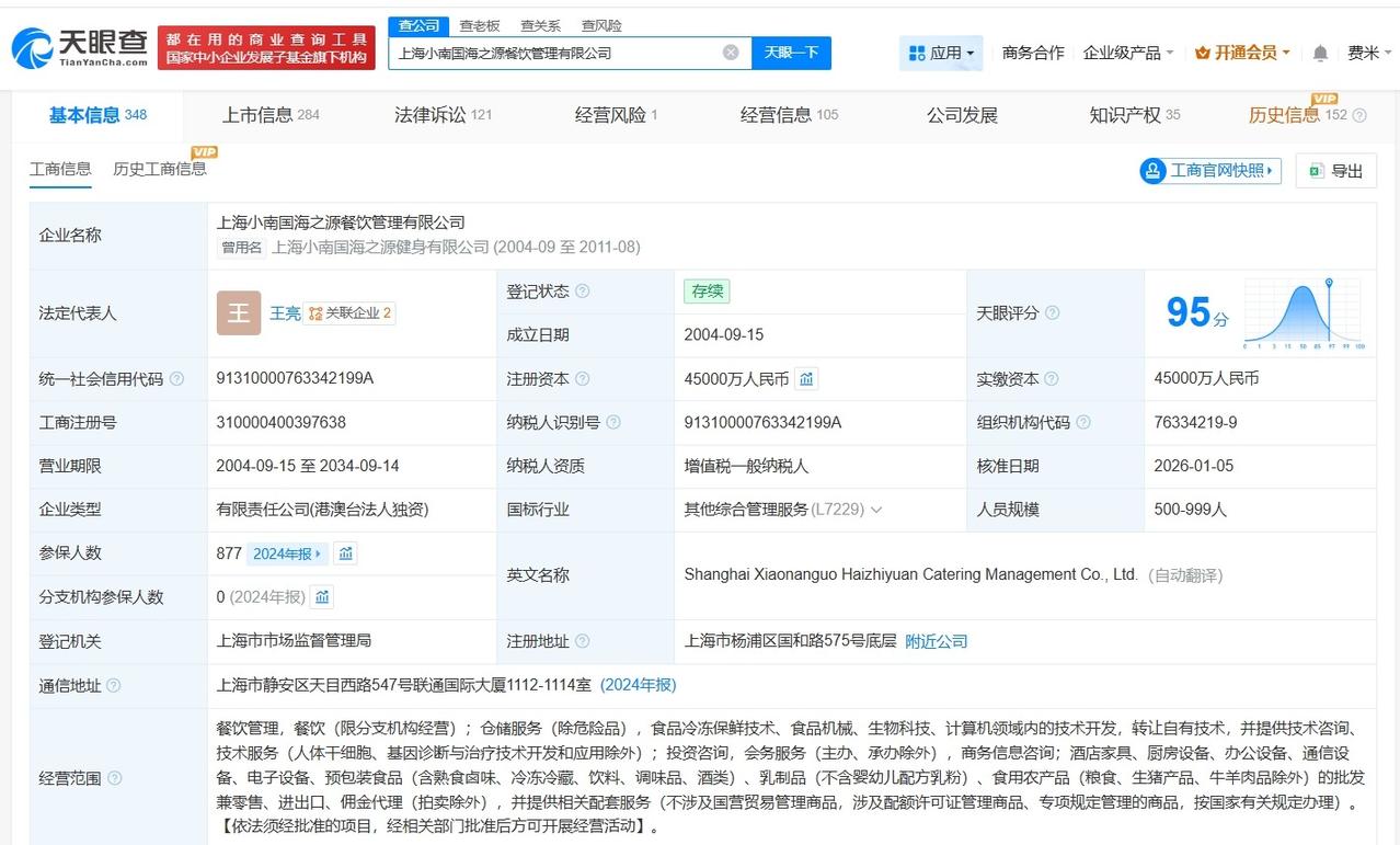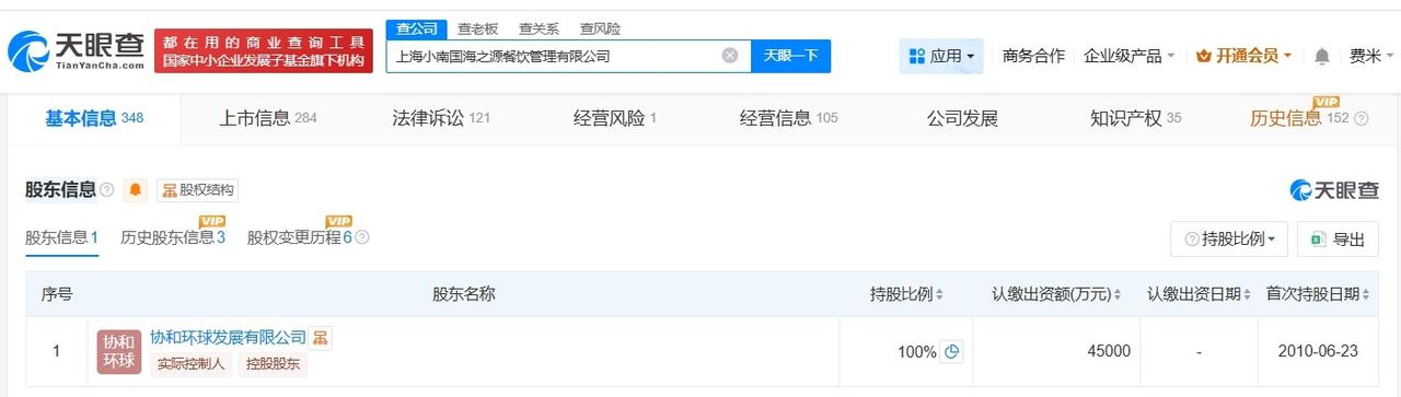 上海小南国被限消 上海小南国今年被多次限消 上海小南国因82万案款被限消 天眼查天眼风险信息显示,近日,上海小南国海之源餐饮管理有限公司新增3条限制消费令,执行法院分别为嘉善县人民法院、浦江县人民法院、上海市浦东新区人民法院。案件流程信息显示,此前,该公司已因上述案件被分别执行51万余元、6.3万元、24万余元。 上海小南国海之源餐饮管理有限公司成立于2004年9月,法定代表人为王亮,注册资本4.5亿人民币,经营范围包括餐饮管理、餐饮、仓储服务等。股东信息显示,该公司由协和环球发展有限公司全资持股。 天眼查信息: