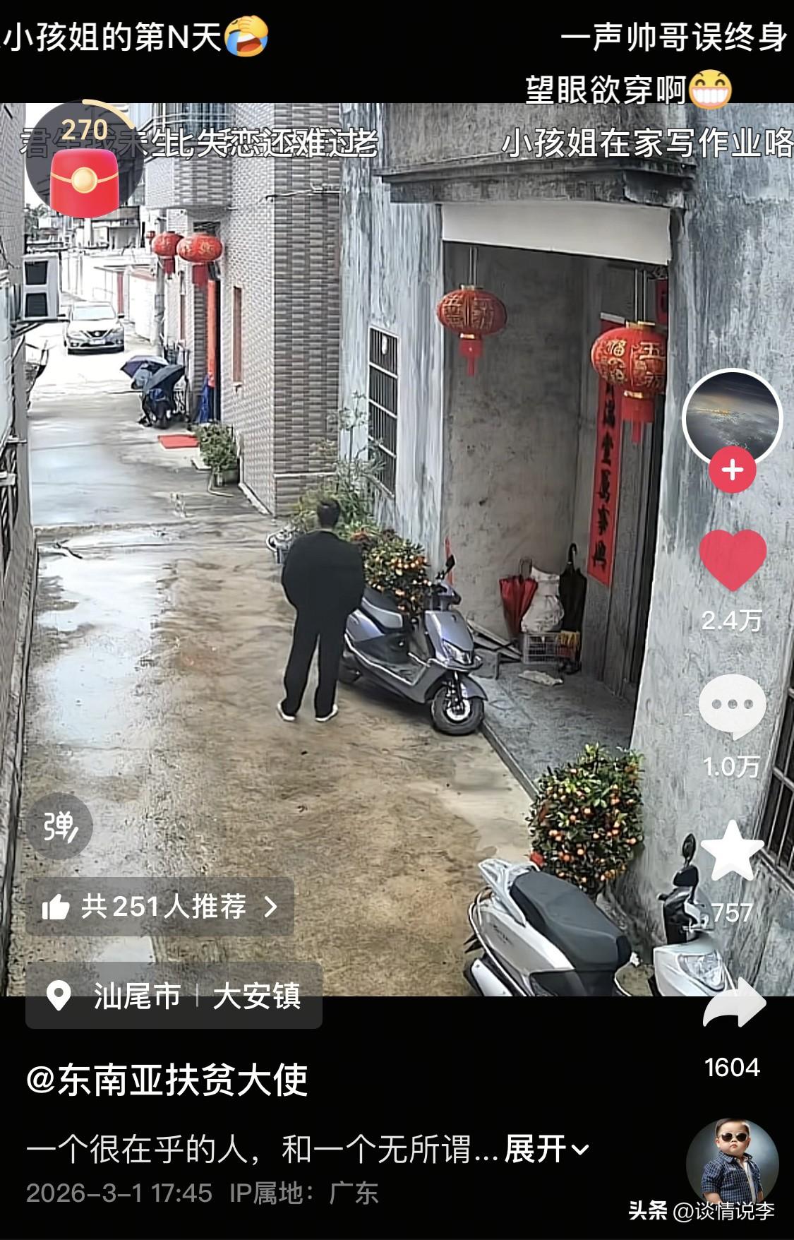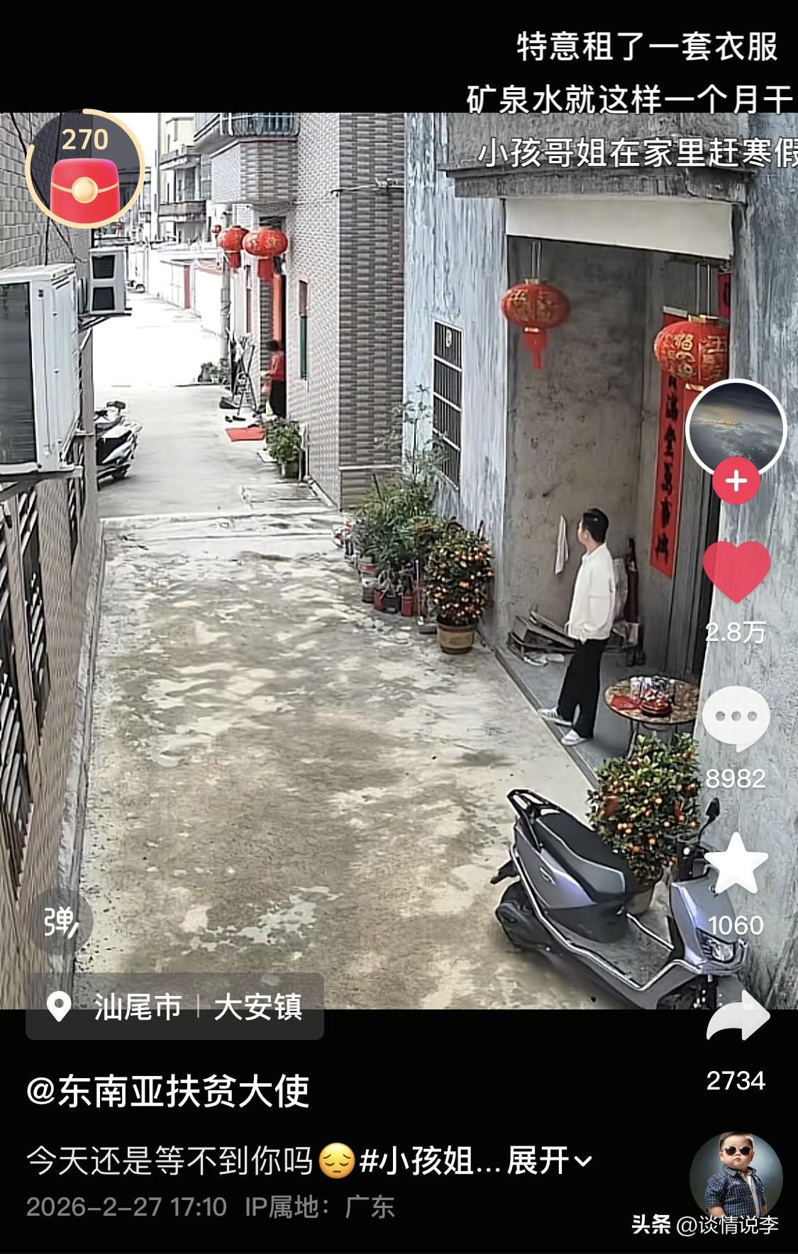 小孩姐的一声“帅哥”,让男子彻底迷失了自我。 这是正月初八的傍晚,广东汕尾市一男子站在自己家门口,好像在等什么,也许,他是在等冥冥中的一个天意。 过了一会儿,从巷尾传来欢声笑语。是三个小孩姐骑着自行车在追逐快乐。 前面一个小孩姐骑着自行车摇摇晃晃地经过男子面前,出其不意地,她的车子晃了一晃,她对着男子脱口而出:“帅哥!” 然后,她连一秒钟也没有停留,继续快乐地骑车远去。巷子里,传来三个小孩姐欢快的声音,余音袅袅。 小孩姐万万没有想到呀,她这一声“帅哥”,让男子彻底迷失了自我。男子沉浸在这一声“帅哥”中无法自拔,拿起矿泉水瓶,战术性地喝水,而他的嘴角,就连AK都压不住呀压不住。 接下来发生的事情,让人有点莫名的“心酸”。 为了小孩姐的一声“帅哥”,男子赶紧回家调监控,把这段视频接下来发布到个人账号上,因为他这辈子还没被人夸过呀,必须发出来呀。 男子还非常听话,听网友的,他在门口摆了一张桌子,放上了牛奶水果零食还有红包,他甚至还去服装店买了一身新的行头,把自己每天打扮得板板正正地,在几乎相同的时间段,在家门口出现,就为了等那个喊他“帅哥”的小孩姐。 只是,有些人,一旦错过,就是一辈子。 男子等啊等等啊等,却再也没能等来那个“调戏”他的小孩姐。 他从朗朗晴天,等到了雨丝缠绵。 他从正月初八,等到了正月十四。 有人在等雨停,有人在等伞,他在等什么呢?