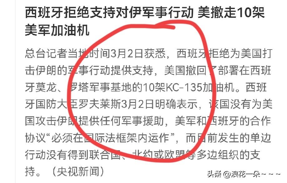 夜已深,不得不说, 美国太不地道了吧?就因为西班牙拒绝支持对伊军事行动,美撤走了10架美军加油机。 你们说这美国做的这事地道嘛。简直让人笑掉大牙,为了自己的利益啥都不管不顾,你让人家西班牙怎么支持你?人家西班牙是在遵守国际法。这都不行? 其实,反过来想想西班牙这事做的太棒了,美国撤走加油机反而是件好事。你看看在中东这么多小国家都放了美军的战机,还不是被伊朗给炸了一个遍吗?而且还导致自己国家很多损失!所以,就让美国不地道去吧。[捂脸]
