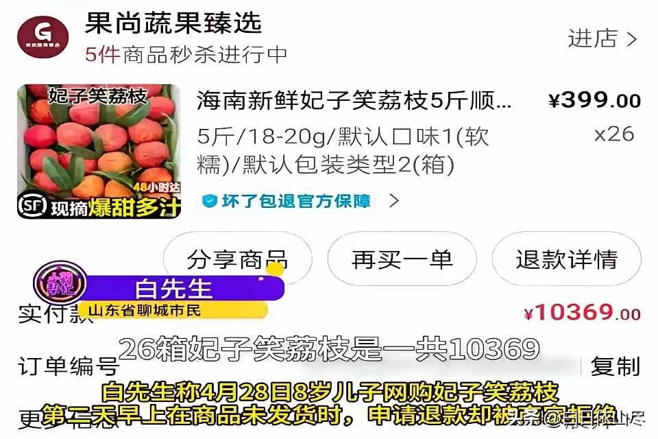 乱套了!山东聊城,一名8岁男孩想要吃荔枝,但父母觉得价格不合适就拒绝了,没想到,孩子记恨在心,趁父母不注意偷偷用手机下单了26箱妃子笑荔枝,花了10000多,家长找商家退款被拒绝,结果一拆箱发现,商家发来的根本不是妃子笑,本来不好退款,现在事情性质一下变了! 2025年4月28日,山东聊城一户普通家庭,因为一箱荔枝引发了一连串让人意外的消费纠纷,事情从孩子一时任性开始,慢慢发展成大额网购、退款被拒、收货货不对板的复杂情况,整个过程真实又贴近生活,也让不少有孩子的家庭感同身受。 当天,家里8岁的男孩想吃荔枝,缠着父母想要购买。父母看了当时的市场价格,觉得当季荔枝售价偏高,再加上担心孩子吃多了伤肠胃,就没有答应孩子的要求。 家长原本以为只是孩子一时兴起,过一会儿就会忘记,并没有多加留意,也没料到孩子会因为这件事做出后续举动。 孩子被拒绝后并没有放弃,反而悄悄记在心里,趁着父母忙于家务、无暇看管的间隙,偷偷拿走了家长的手机。 平时孩子经常看大人网购,早已记住了解锁密码和支付密码,操作购物平台也十分熟练,整个过程安静顺利,没有被家人发现任何异常。 拿到手机后,孩子直接在购物平台搜索荔枝,选中一款标注为海南妃子笑的商品,单箱5斤,单价399元。 孩子完全没有考虑价格和数量,只是一心想买到荔枝,直接下单26箱,迅速完成支付。这笔订单总金额达到10374元,对于普通家庭而言,是一笔不小的开支。 支付完成后,孩子把手机放回原位,刻意删掉了支付提醒和订单消息,装作什么都没发生。 家长对此毫不知情,直到第二天翻看手机账单,才突然看到这笔大额支出,当即吓了一跳,赶紧点开购物平台核对,确认是26箱妃子笑荔枝的订单。 此时商家还未发货,家长立刻在平台提交退款申请,希望在发货前取消交易,减少损失。 家长连续申请两次,还特意备注是未成年人误操作,可两次退款都被商家直接驳回,订单自动进入发货流程,无法再自主取消。 家长不甘心,多次通过平台和商家沟通,详细说明订单是8岁孩子私自下单,并非成年人真实意愿,希望对方体谅并同意退款。 但商家始终坚持,生鲜水果一旦下单不支持无理由退款,出库后无法二次销售,按照平台规则不能退单,无论家长怎么解释,都坚决拒绝协商,坚持正常配送。 几天后,26箱荔枝分批送到家中,纸箱堆在家门口和楼道里,数量十分可观。家长想着退款已经无望,只能打算拆箱检查,尽量转售一部分降低损失,为了留证,全程录制开箱视频,每一个步骤都记录得十分清楚。 可打开第一箱,家长就发现情况不对,箱内荔枝根本不是订单上写明的妃子笑。妃子笑果皮有明显凸起纹理,果形饱满,属于中高端品种,而收到的荔枝果皮光滑、果型偏小,是市面上价格低很多的普通荔枝,两者外观、品种、价位差距都非常明显。 家长接连拆开多箱检查,发现全部26箱都是同一种普通荔枝,没有一箱符合订单标注的妃子笑规格,货不对板的情况十分突出。这一变化,也让原本被动的退款局面,彻底发生了转变。 家长立刻整理好全部证据,包括订单截图、支付记录、完整开箱视频、货品对比照片、与商家的聊天记录等,全部妥善保存,再次联系商家,质问货品与描述不符的问题。 商家面对清晰证据,依然坚称发出的货品与订单一致,不承认发错货、以次充好,双方沟通多次,始终无法达成一致,矛盾进一步升级。 无奈之下,家长拨打投诉电话,向当地市场监管部门反映情况,提交所有材料,申请介入处理。 工作人员接到投诉后,按照流程受理案件,对商家的商品宣传页、出库记录、实际货品进行逐一核实比对,确认商品与订单描述不一致,后续展开正式调查与调解。 荔枝属于生鲜易腐食品,不耐存放,即便家长尽量放在阴凉通风处保存,随着时间推移,部分荔枝还是陆续出现发黑、变软、腐烂的情况,损耗越来越大。 家长只能尽力保管剩余果品,全程配合监管部门的问询、取证和调解工作,耐心等待处理结果。 整件事看似小事引发,却牵扯到多个现实问题。孩子私自使用手机大额支付,反映出家庭日常手机与支付管理的细节问题; 商家拒绝未成年人误操作订单的退款,也触及了生鲜电商常见的售后规则争议;而后期出现的货不对板,则直接涉及商家履约与商品宣传真实性问题。 从孩子赌气下单,到家长退款被拒,再到收货发现品种不符,整个过程环环相扣,没有夸张情节,全部都是真实发生的生活细节。 随着监管部门介入,事件进入正规处理流程,后续的责任划分、退款方案、货品处置等,也都在逐步推进中。这件事也让不少网友关注,未成年人网购、生鲜售后、商家诚信等问题,再一次成为大家讨论的焦点。 对此,你们有什么看法,欢迎评论留言~