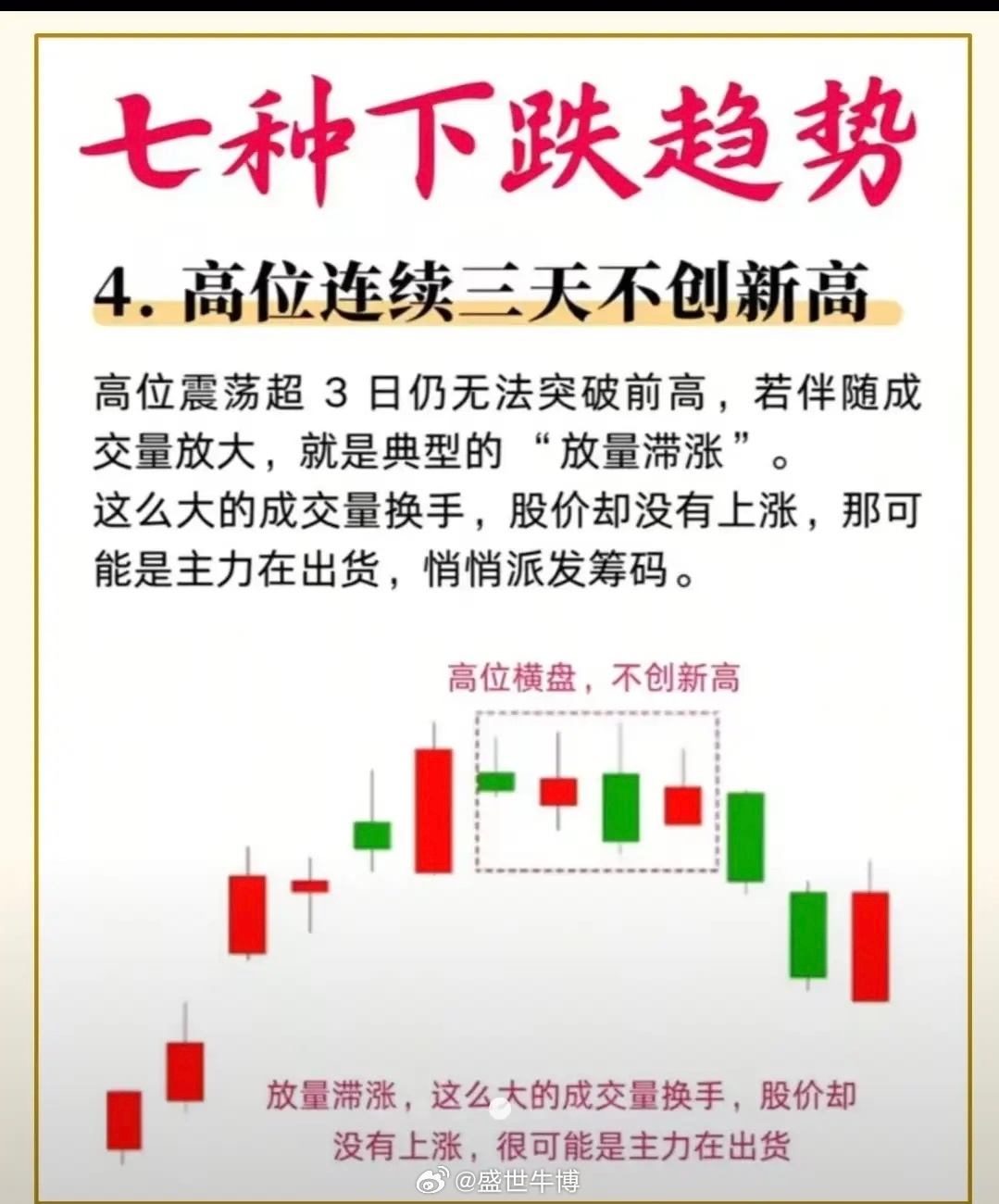 高位连续 3 天不创新高卖出。这是最精炼、直接执行的实战铁律:高位3天不新高,果断离场不恋战。执行规则- 股价处于高位、波段高点- 连续 3 天无法突破前高- 重心下移、量能萎缩👉 直接卖出,锁定利润这是专门防高位滞涨、主力出货的神纪律。
