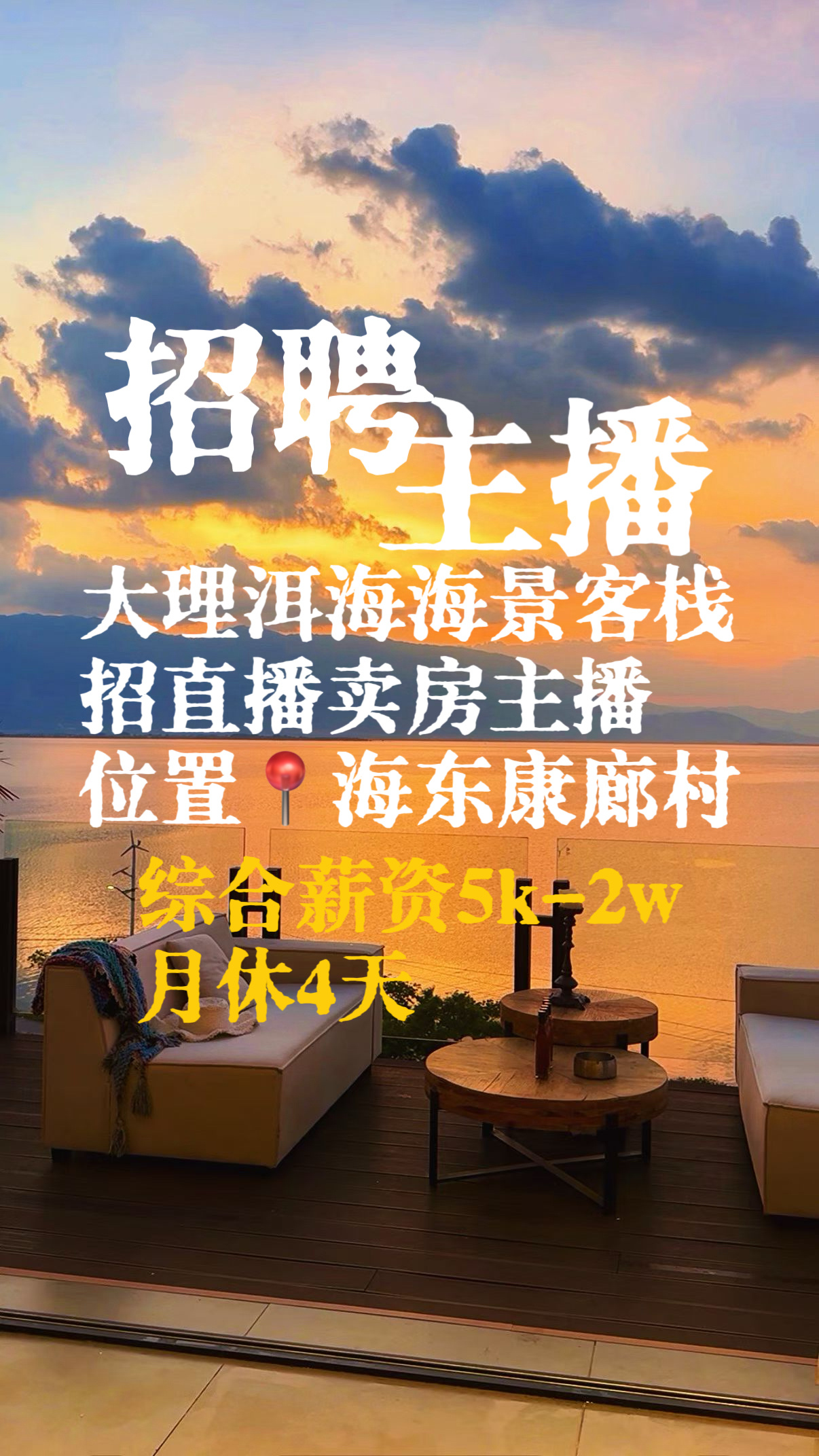 【大理招聘|洱海海景客栈招募直播主播】把工作过成旅居,在洱海边遇见同频的人我们在大理挖色镇康廊村,一线临海、安静治愈,出门就是洱海生态廊道,看日出日落超绝。现寻找热爱生活、喜欢分享的小伙伴,一起用镜头记录大理的美好。工作内容民宿日常直播,展示环境、房型、小院与洱海风光线上友好互动,解答出行、住宿相关咨询配合拍摄短视频,记录民宿日常与大理美景遵守平台规则,内容真实温和、正向分享每天播2场,月休4天,吃住优待,有想法享话语权