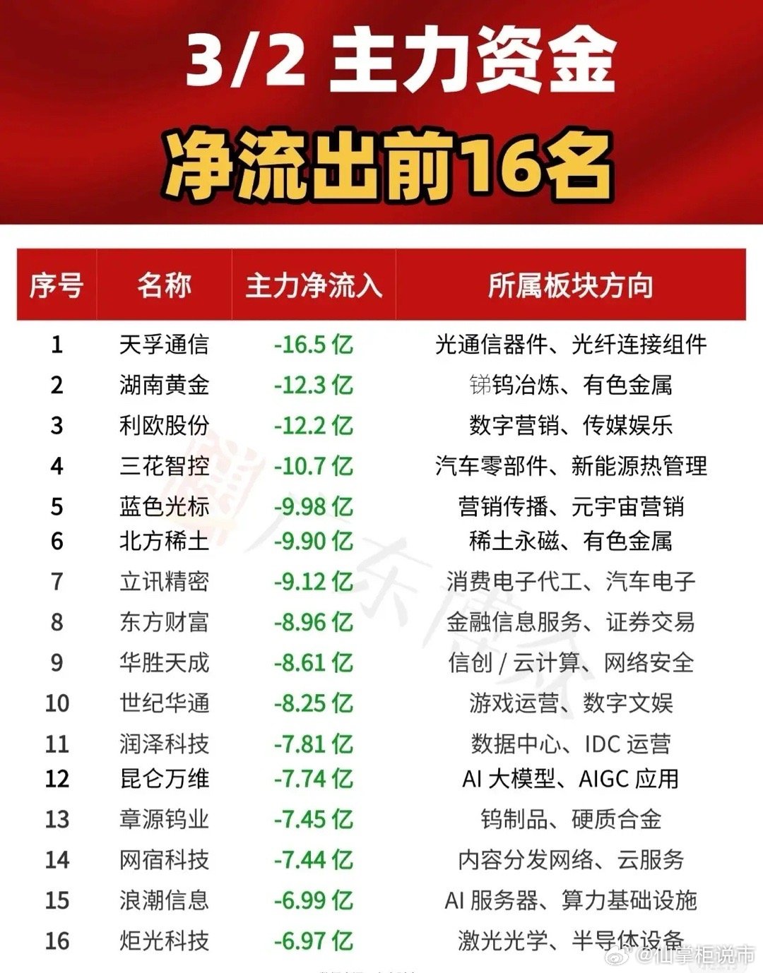 3月2日主力资金净流出前16名的股票及所属板块方向如下:天孚通信(光通信器件、光纤连接组件)净流出16.5亿;湖南黄金(锑钨冶炼、有色金属)净流出12.3亿;利欧股份(数字营销、传媒娱乐)净流出12.2亿;三花智控(汽车零部件、新能源热管理)净流出10.7亿;蓝色光标(营销传播、元宇宙营销)净流出9.98亿;北方稀土(稀土永磁、有色金属)净流出9.90亿;立讯精密(消费电子代工、汽车电子)净流出9.12亿;东方财富(金融信息服务、证券交易)净流出8.96亿;华胜天成(信创/云计算、网络安全)净流出8.61亿;世纪华通(游戏运营、数字文娱)净流出8.25亿;润泽科技(数据中心、IDC运营)净流出7.81亿;昆仑万维(AI大模型、AIGC应用)净流出7.74亿;章源钨业(钨制品、硬质合金)净流出7.45亿;网宿科技(内容分发网络、云服务)净流出7.44亿;浪潮信息(AI服务器、算力基础设施)净流出6.99亿;炬光科技(激光光学、半导体设备)净流出6.97亿。