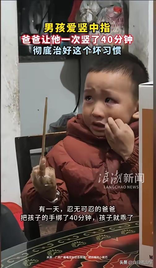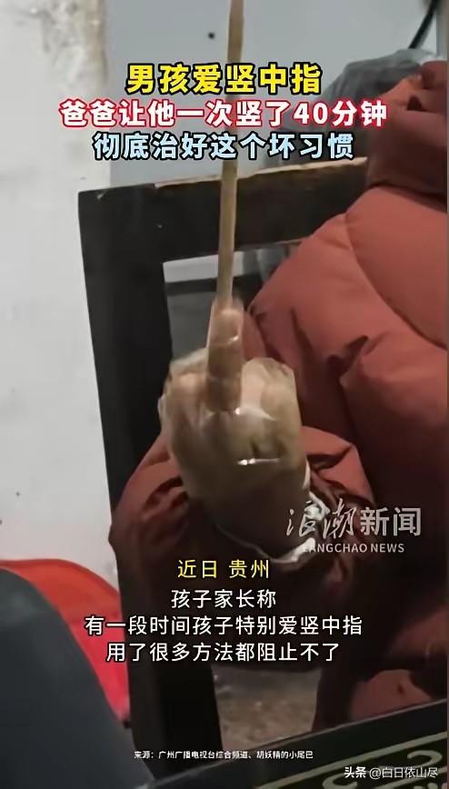 “看你改不改!”近日,贵州,一小男孩学会了竖中指,家长屡教不改。孩子的爸爸一怒之下,强制让孩子竖了40分钟,过程中哭闹求饶都不行,让他一次性竖了个够。这之后,彻底治好了孩子的这个坏习惯。玩过:以后还竖不竖中指啦? 2026年2月28日,贵州贵阳,一名学龄前男孩在家中频繁做出竖中指的不文明手势,家长多次劝导无果后,父亲采取了特殊的纠正方式,引发不少家长关注。 这名男孩平日里活泼好动,在日常玩耍与社交过程中,无意间学会了竖中指这一带有冒犯性的手势,起初只是觉得新奇有趣,随后便频繁对着家人做出该动作, 即便家长反复告知这样的行为不礼貌、不合适,孩子依旧没有改正,反而觉得好玩,多次重复这一动作,常规的口头教育、行为提醒都没能起到作用,家长为此感到十分头疼。 孩子的父亲在多次尝试温和引导失败后,决定用体验式的方式让孩子直观感受行为带来的感受,他找来普通的硬质筷子与无痕胶带,将孩子的中指与筷子贴合固定,再用胶带轻轻缠绕包裹,让手指保持竖中指的固定姿势, 全程没有用力拉扯或造成身体损伤,只是单纯固定手势形态。固定完成后,父亲让孩子保持这个姿势不动,全程持续整整四十分钟, 期间孩子因为手臂与手指酸胀不适,逐渐从嬉闹转为委屈,身体不断扭动试图挣脱,眼泪不停掉落,还不断做出求饶的肢体动作,希望父亲解开胶带与筷子,恢复手部自由。 整个过程中,父亲始终站在一旁陪伴,没有呵斥也没有打骂,只是坚持让孩子完成既定的时长,没有因为孩子的哭闹与求饶提前松绑。 孩子在持续的酸胀感中,慢慢失去了最初的嬉闹心态,全程安静下来,专注于手部的不适感,不再有主动模仿手势的兴致。 四十分钟时间一到,父亲立刻轻柔地解开胶带与筷子,检查孩子手指与手腕没有红肿、勒痕等不适状况,随后让孩子活动手部放松肌肉。 经过这次完整的体验式纠正,孩子彻底改变了随意竖中指的习惯,后续在家中、户外玩耍时,再也没有主动做出过这一不文明手势,原本顽固的坏习惯被一次性纠正,家长也无需再反复提醒约束。 2026年国内儿童行为养成研究数据显示,低龄儿童的不良行为多源于模仿与好奇,单纯说教难以形成深刻记忆,适度的体验式约束,能让孩子直观感知行为边界,比反复口头提醒更易形成行为认知,这一结论也与此次家庭纠正过程相契合。 当下家庭教育场景中,低龄儿童行为习惯培养备受关注,2026年新版家庭教育指导指南也明确,纠正孩子不良行为需兼顾适度与边界,以引导认知为核心,避免过度惩戒与情绪宣泄 此次家长的处理方式,全程以行为纠正为目的,没有造成身体伤害,最终达成了理想的纠正效果,也为不少面临同类育儿问题的家庭提供了真实参考。 对此,你们有什么看法,欢迎评论留言~