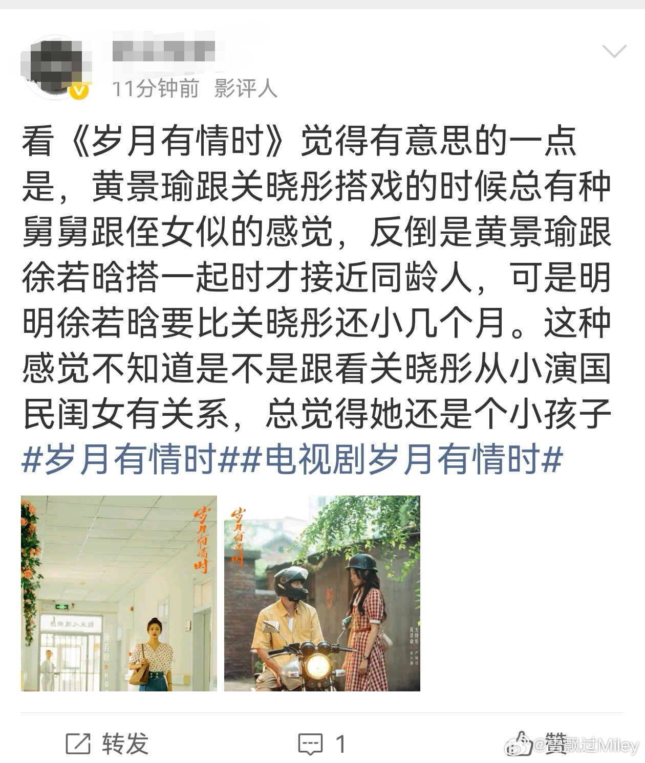关晓彤岁月有情时关晓彤严晓丹 今天看完两集岁月有情时心里不舒服,今天两集严晓丹只出现不到1分钟吧。没有女主戏也行,但是你不能把女主改的像个忘恩负义的人。她有理想有抱负,追求自己的事业没有毛病,如果为了爱情放弃事业又会一堆人出来说恋爱脑。两个人恋爱是相互付出的,严晓丹为了小满在上海上学期间也没有在学校谈恋爱呀,好多人在那个时候也会变心的。所以两个人是相爱的。后来异国恋两个人确实差距太大,严晓丹去日本看到小满打拳决定放手,因为晓丹也是爱着小满的,不想他再那么累,两个人打电话没有说分手,但是彼此已经感受到了,缘分到了。这部剧看到这,感觉女主就是个衬托,没有强调一个女孩子自己一路学习,在异国他乡自己独立的不容易,一味强调男主一个的不断付出。只能说我为了关晓彤会坚持看完,希望以后接剧的时候可要看仔细,最开始宣传就被边缘化,之后各种操作很迷惑。下面这张图就是广场上已经开始拉踩了,关晓彤以后接剧可看好宣传方向吧。最后我支持严晓丹,现实生活中没有那么多张小满,女人没有事业等到男人变心的时候,哭都找不着调。期待关晓彤待播剧。