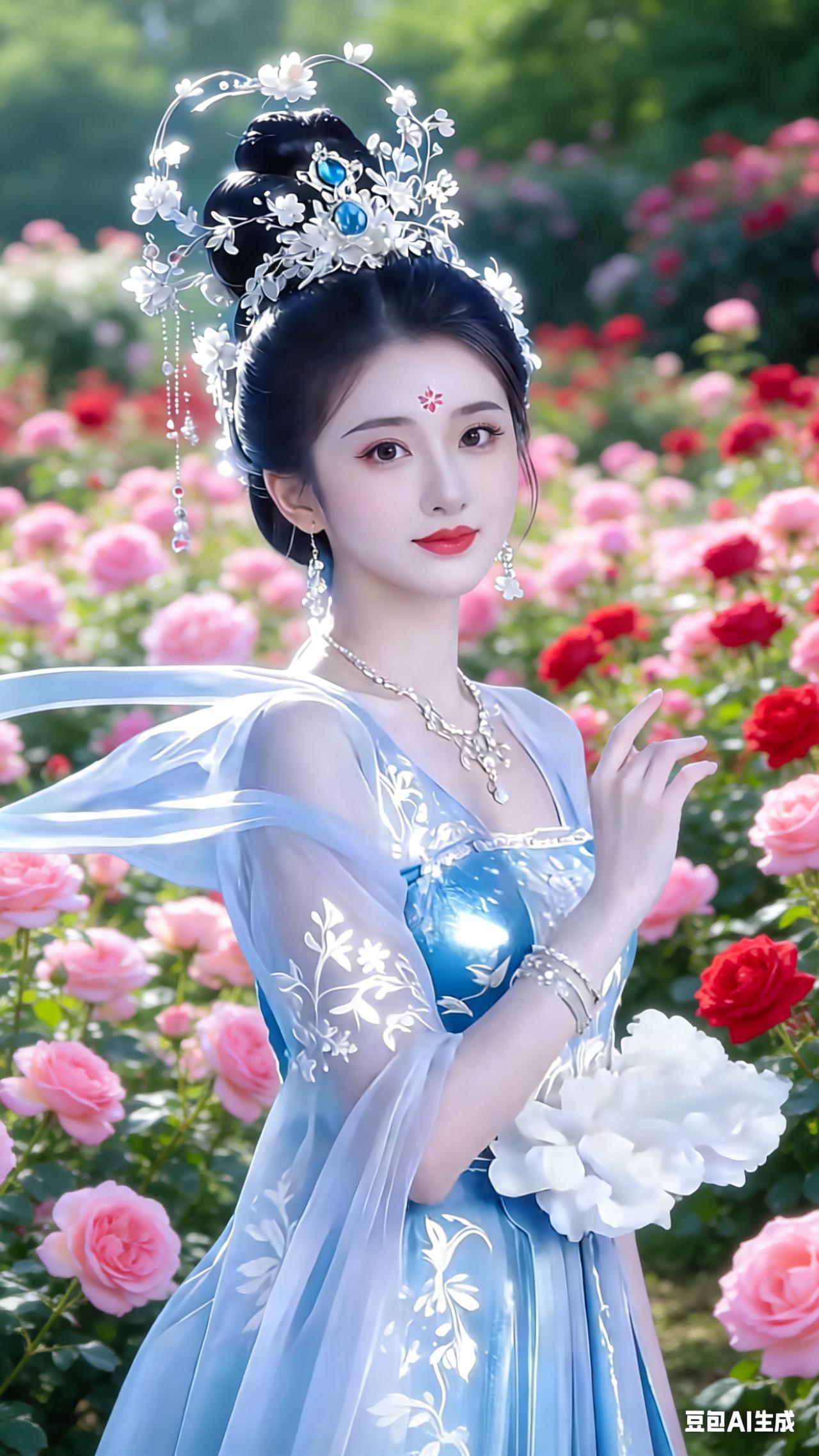古装佳人静立月季花海,粉艳与绯红层层叠叠,繁花似锦,暗香浮动。衣袂轻扬,眉眼温婉,与满园春色相映成画,背景朦胧虚化,更显意境柔美雅致。
