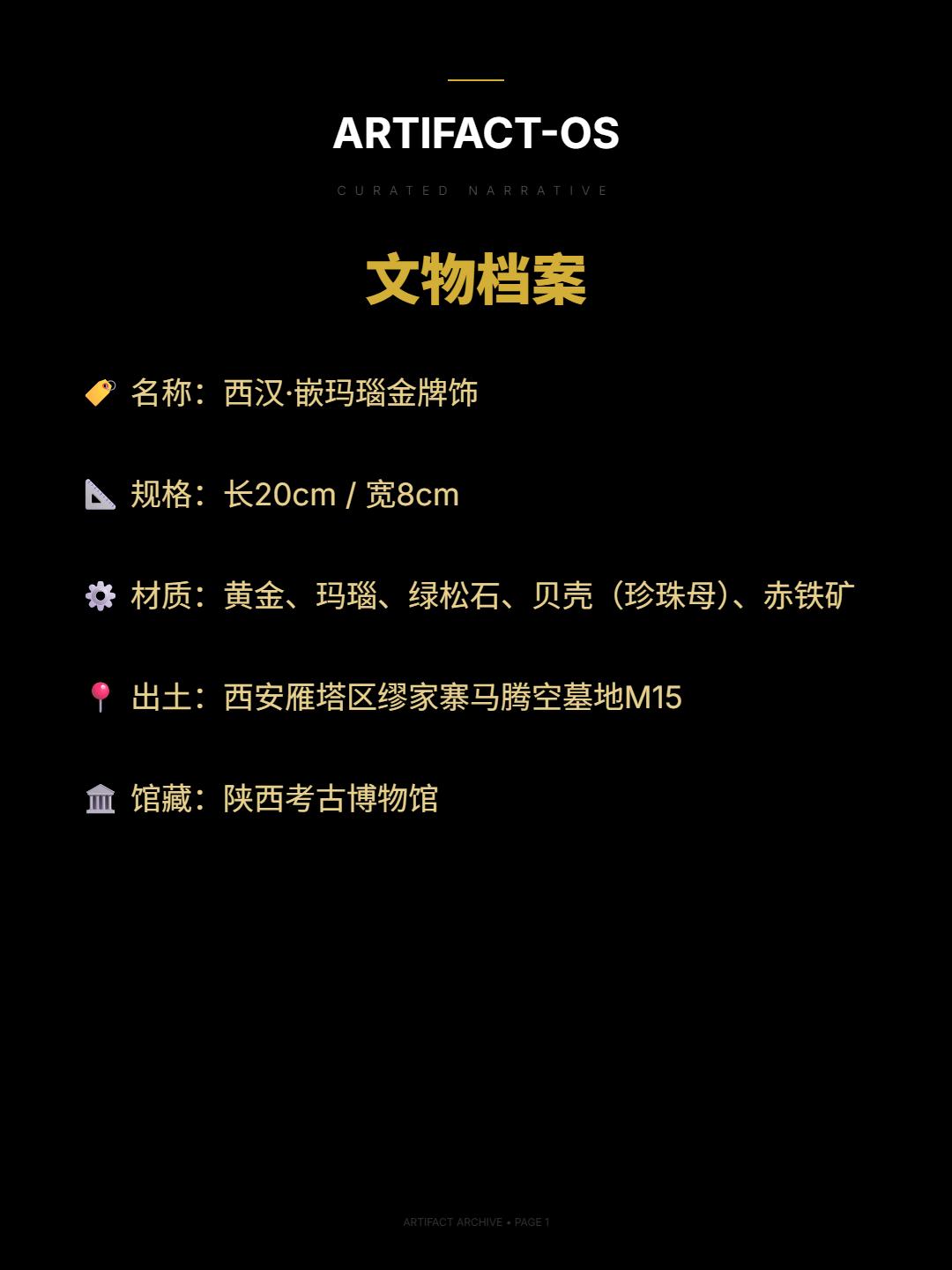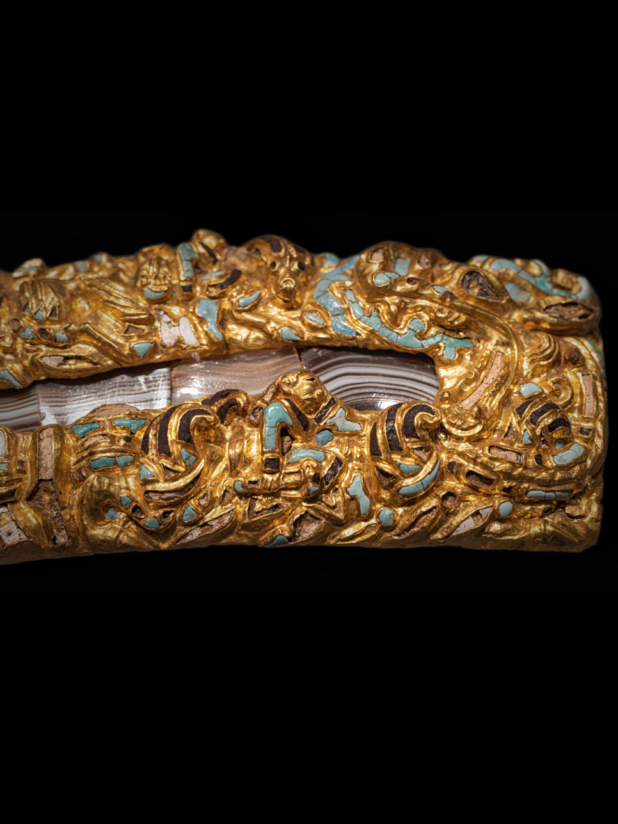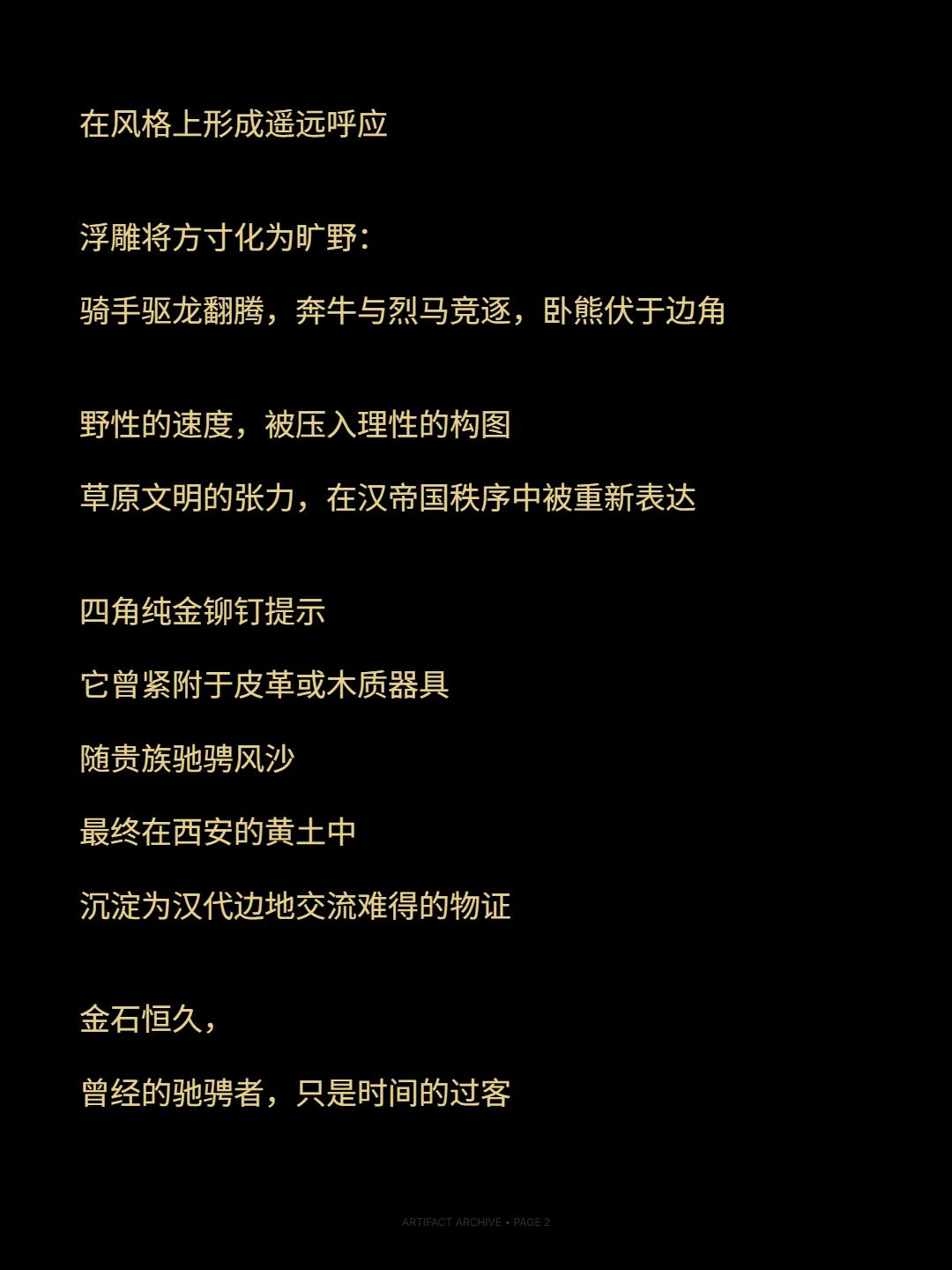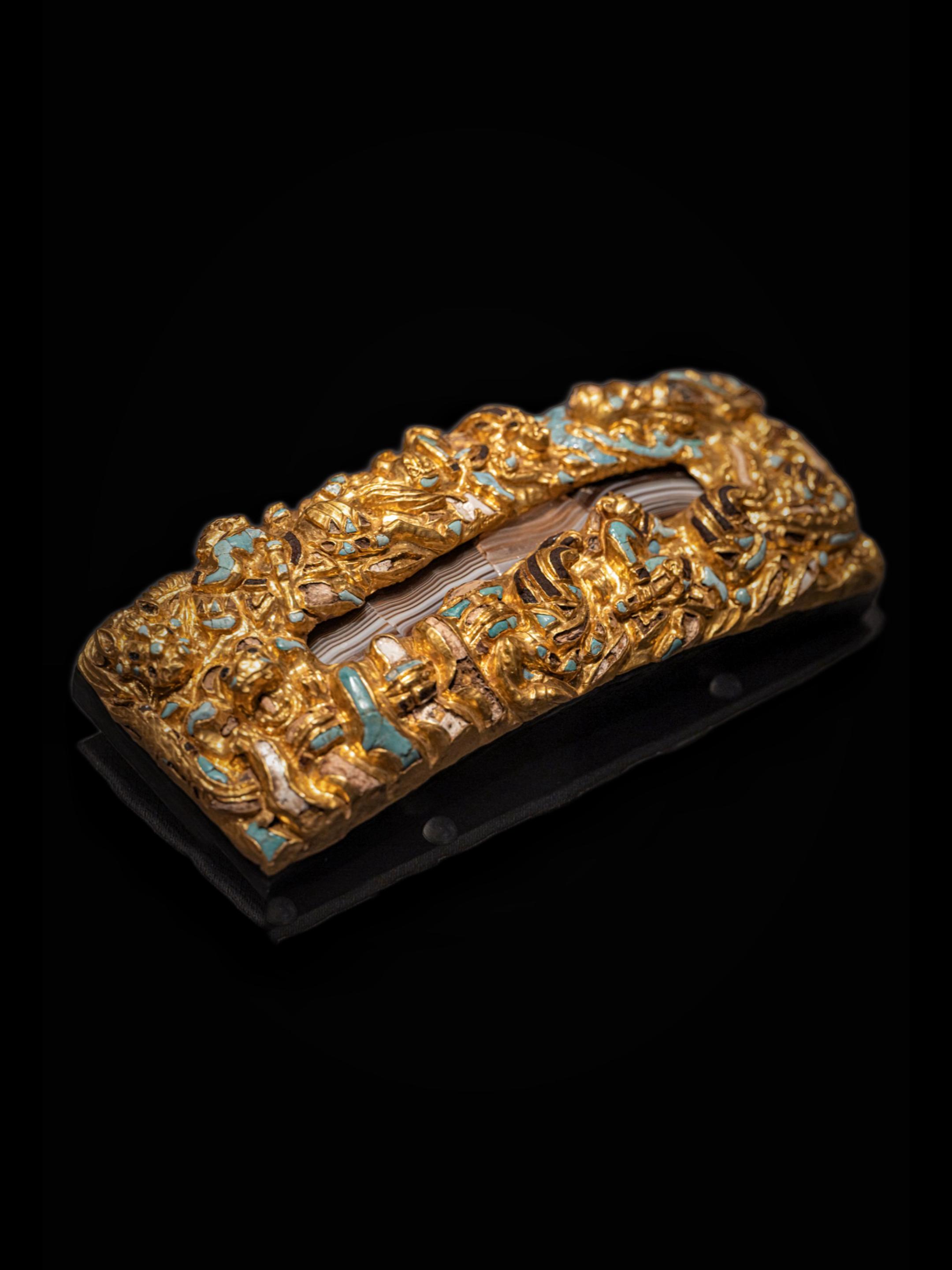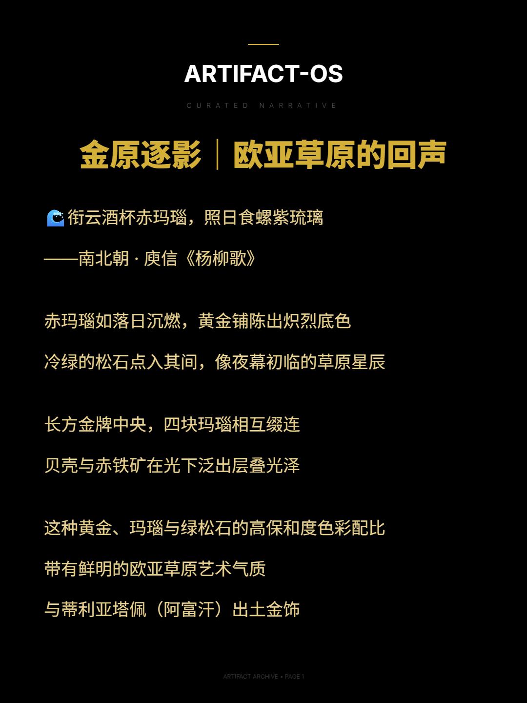 金原逐影|欧亚草原的回声。🌊衔云酒杯赤玛瑙,照日食螺紫琉璃 ——南北朝 · 庾信《杨柳歌》 赤玛瑙如落日沉燃,黄金铺陈出炽烈底色 冷绿的松石点入其间,像夜幕初临的草原星辰 长方金牌中央,四块玛瑙相互缀连 贝壳与赤铁矿在光下泛出层叠光泽 这种黄金、玛瑙与绿松石的高保和度色彩配比 带有鲜明的欧亚草原艺术气质 与蒂利亚塔佩(阿富汗)出土金饰 在风格上形成遥远呼应 浮雕将方寸化为旷野: 骑手驱龙翻腾,奔牛与烈马竞逐,卧熊伏于边角 野性的速度,被压入理性的构图 草原文明的张力,在汉帝国秩序中被重新表达