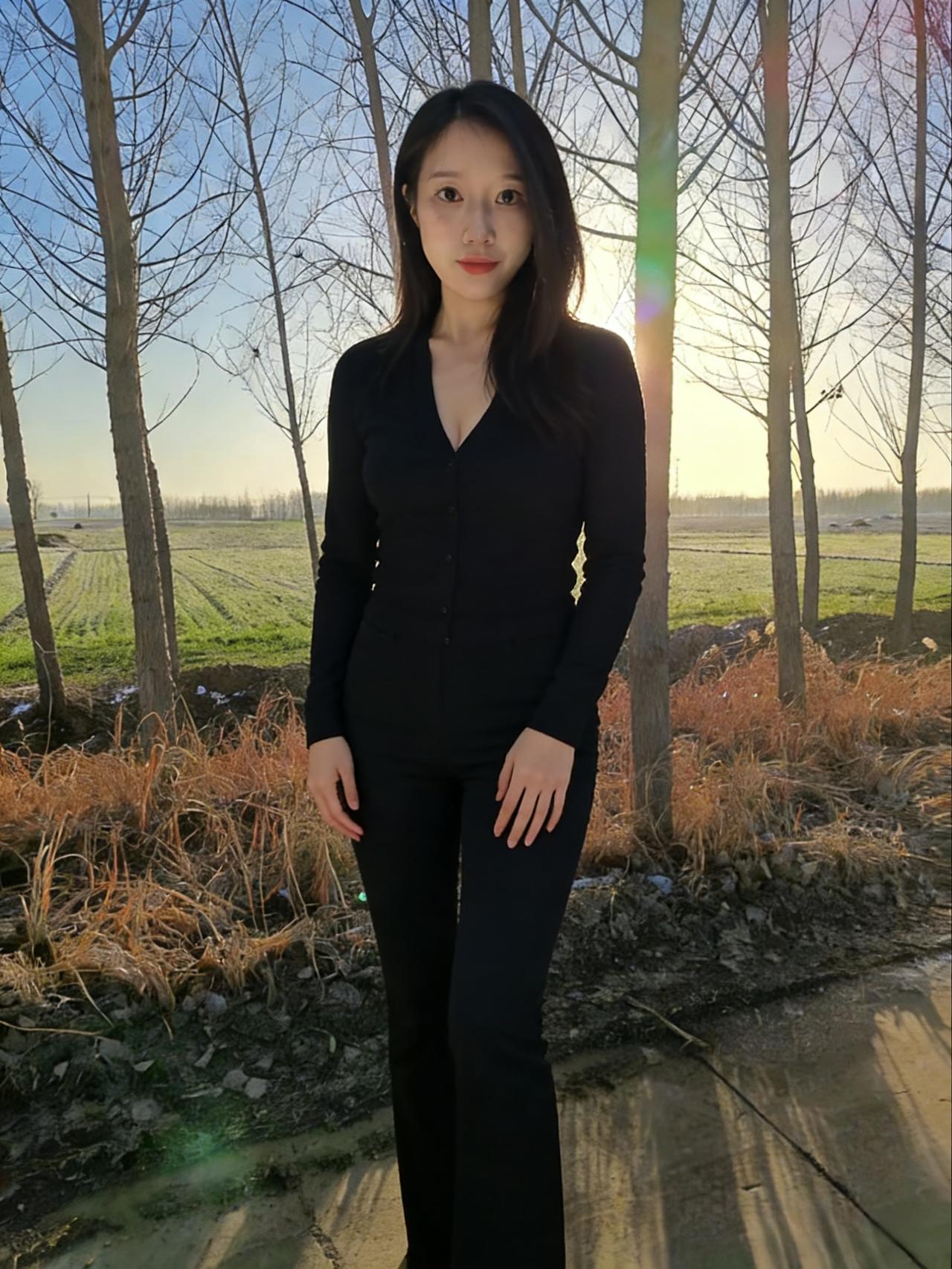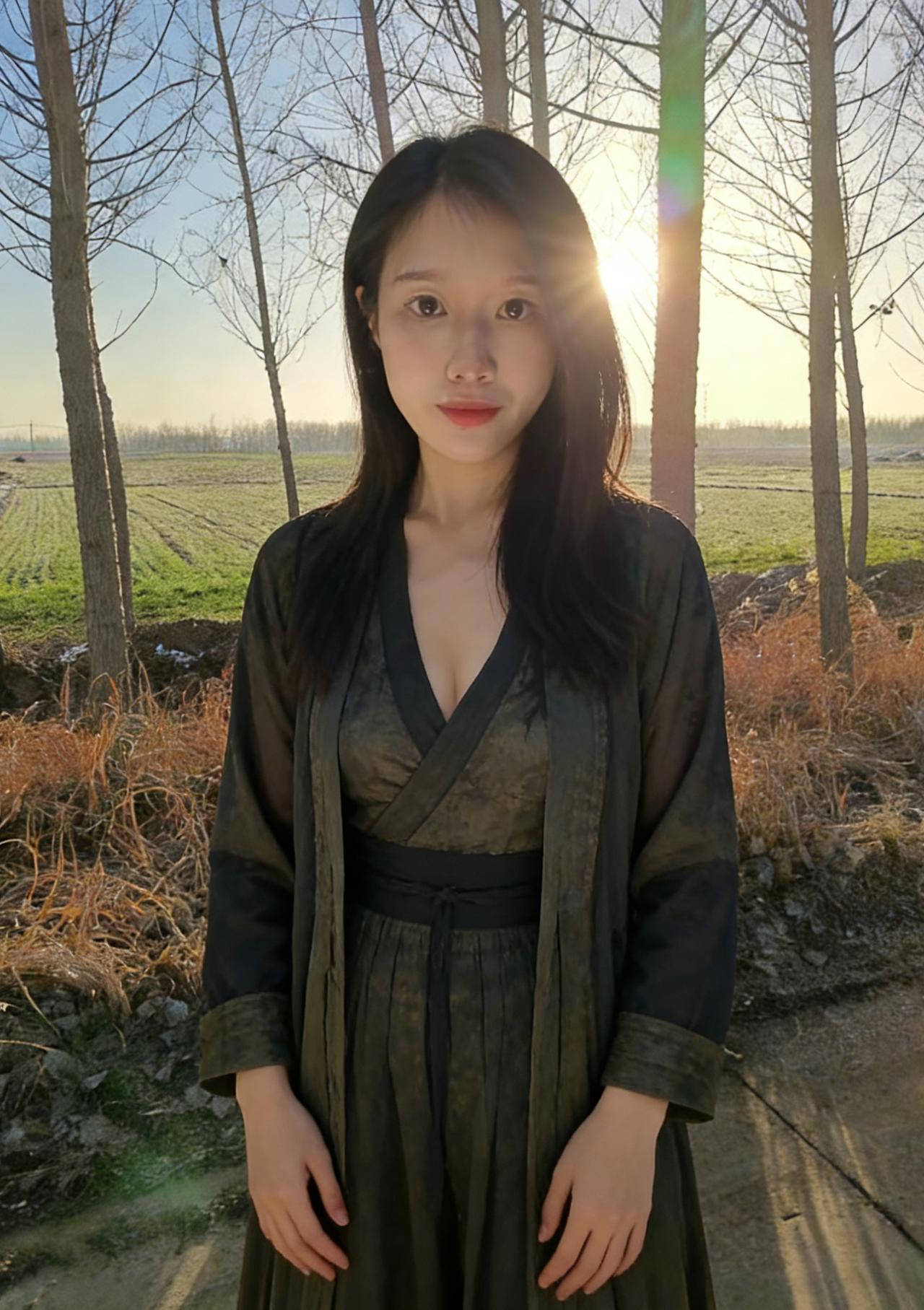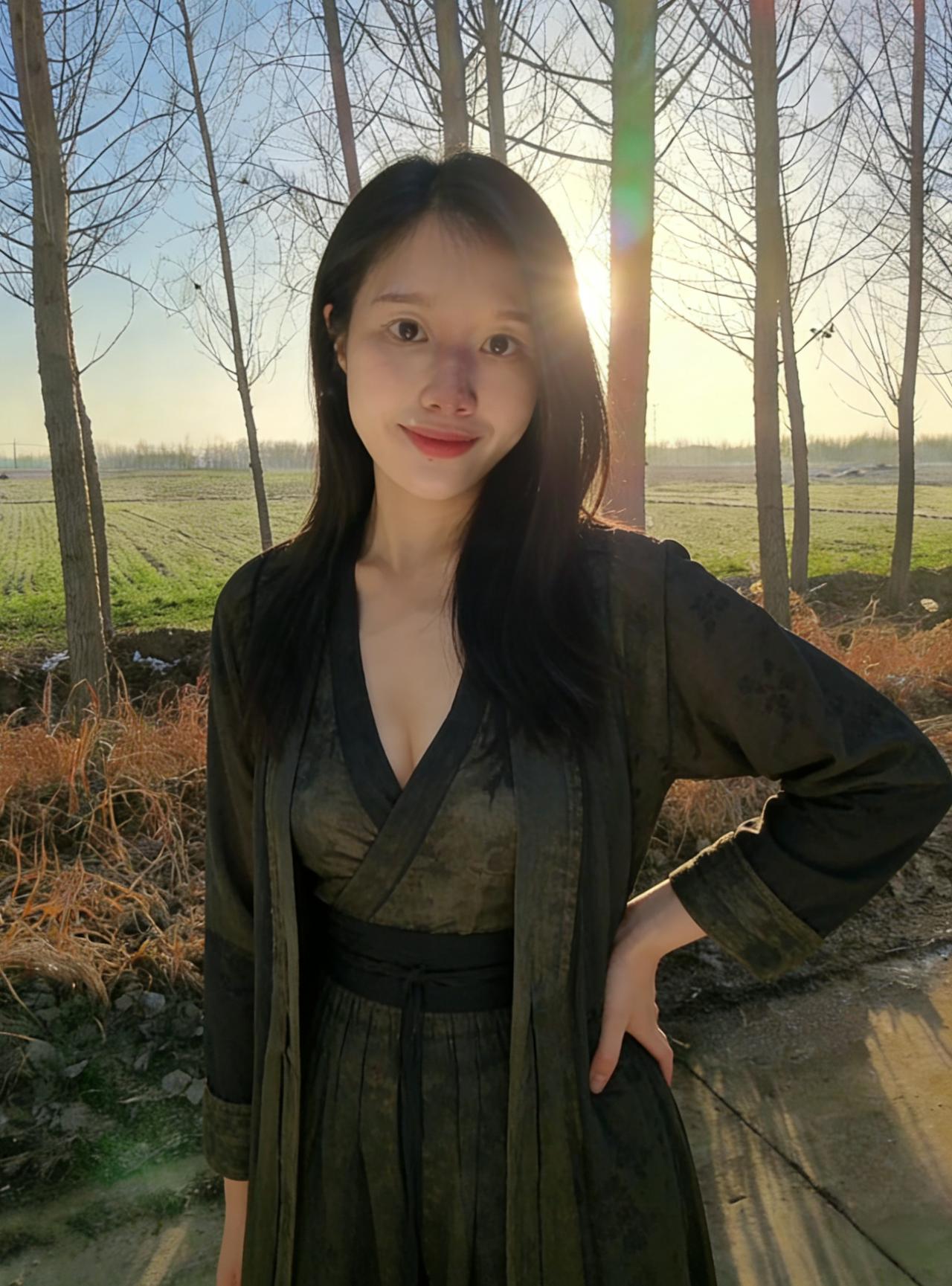 暖阳穿木洒金痕,素袂临风立荒村。 眉眼温柔含静气,一颦一笑醉晨昏。