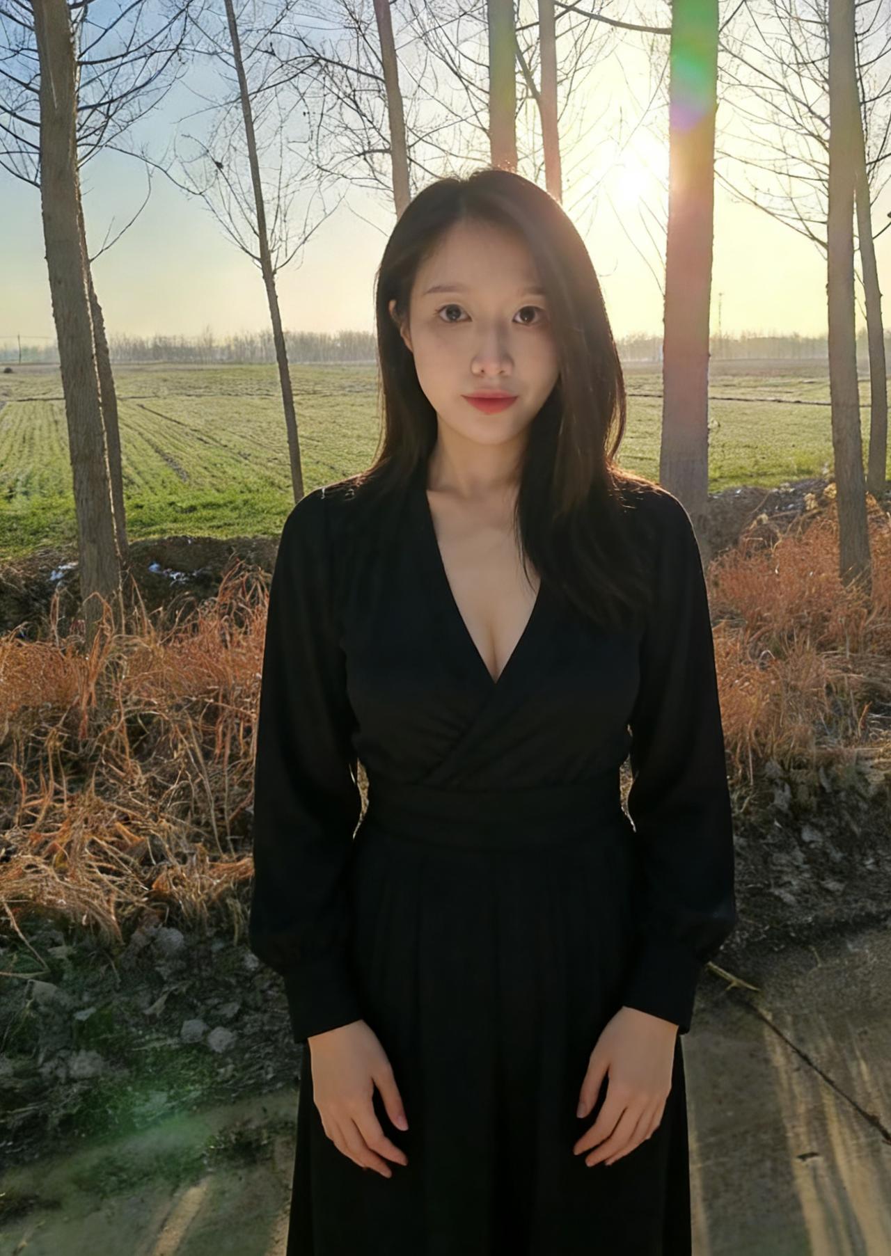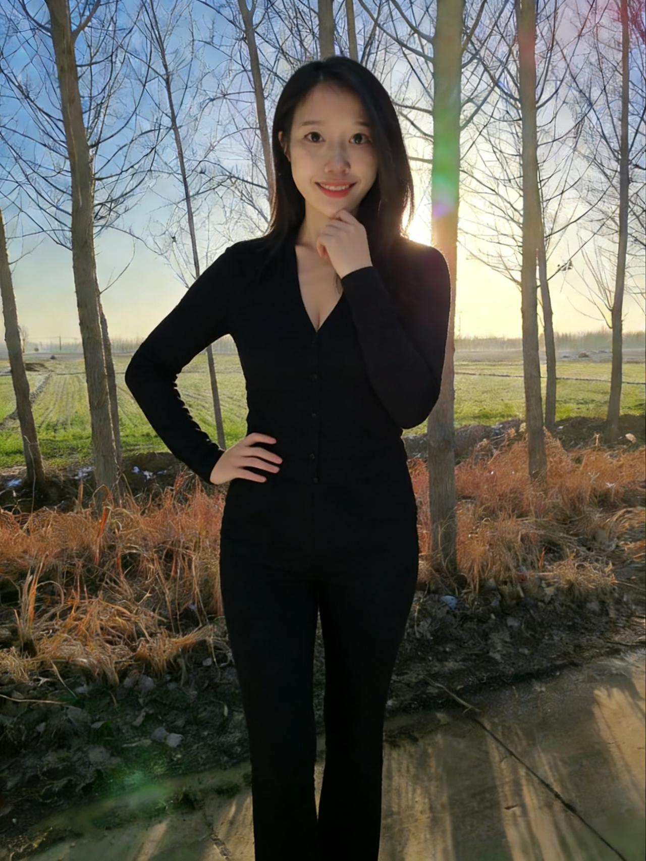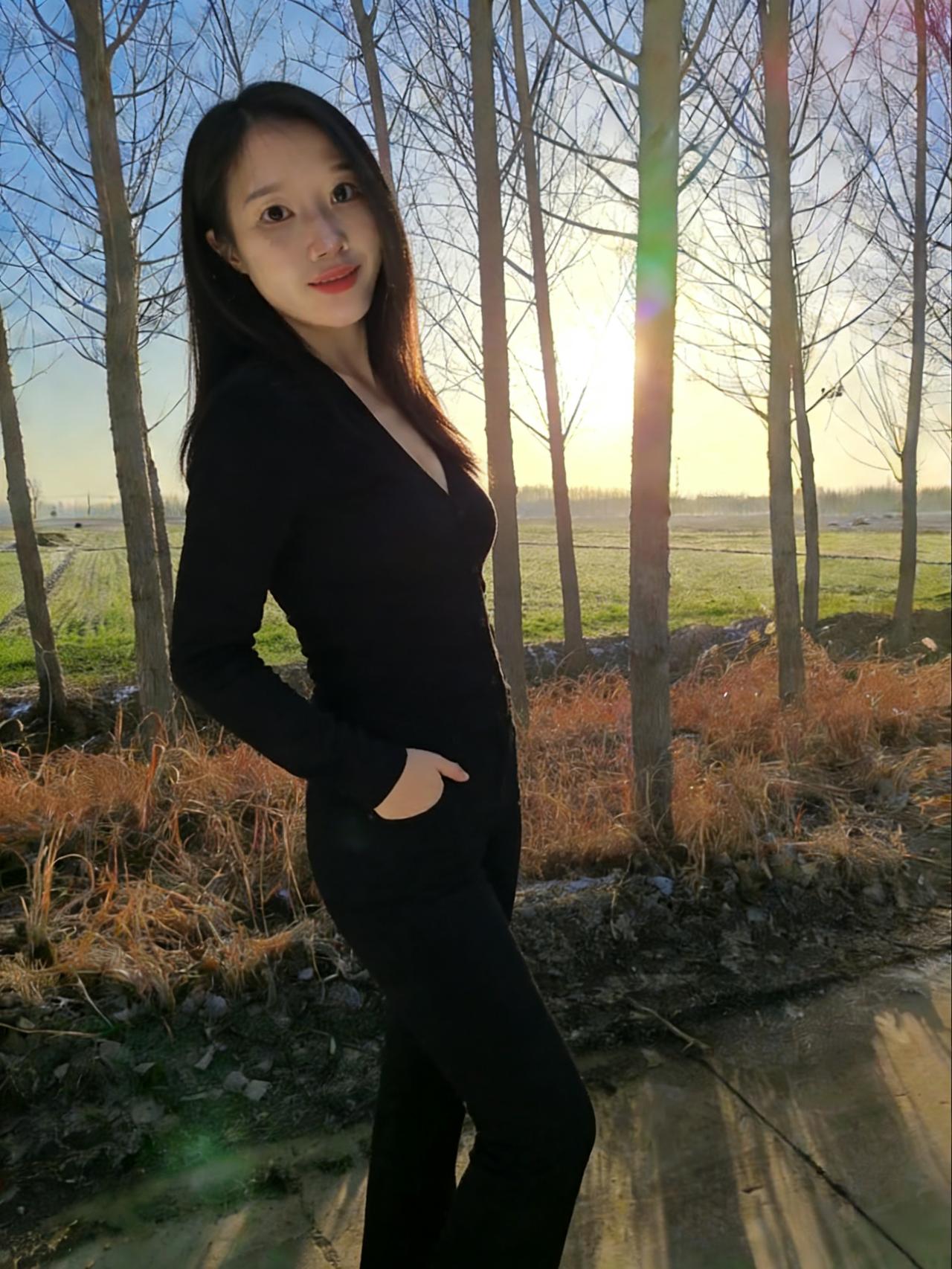 暖阳穿木洒金痕,素袂临风立荒村。 眉眼温柔含静气,一颦一笑醉晨昏。