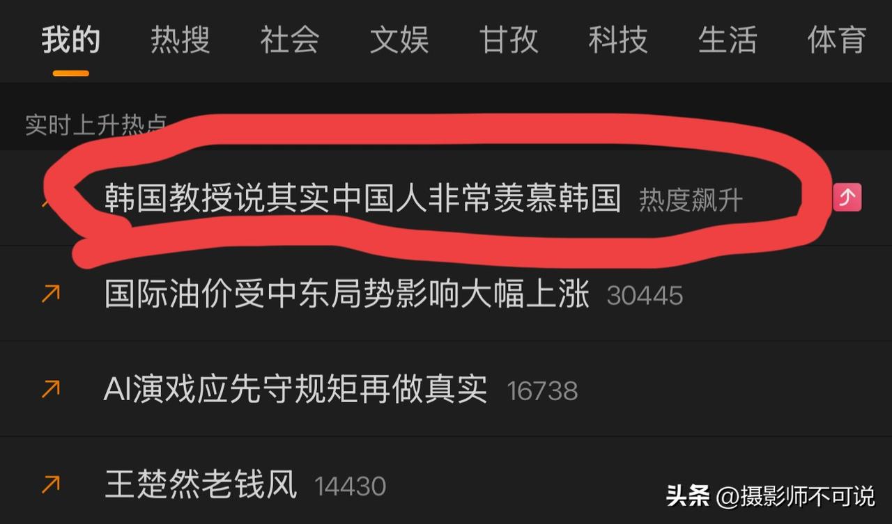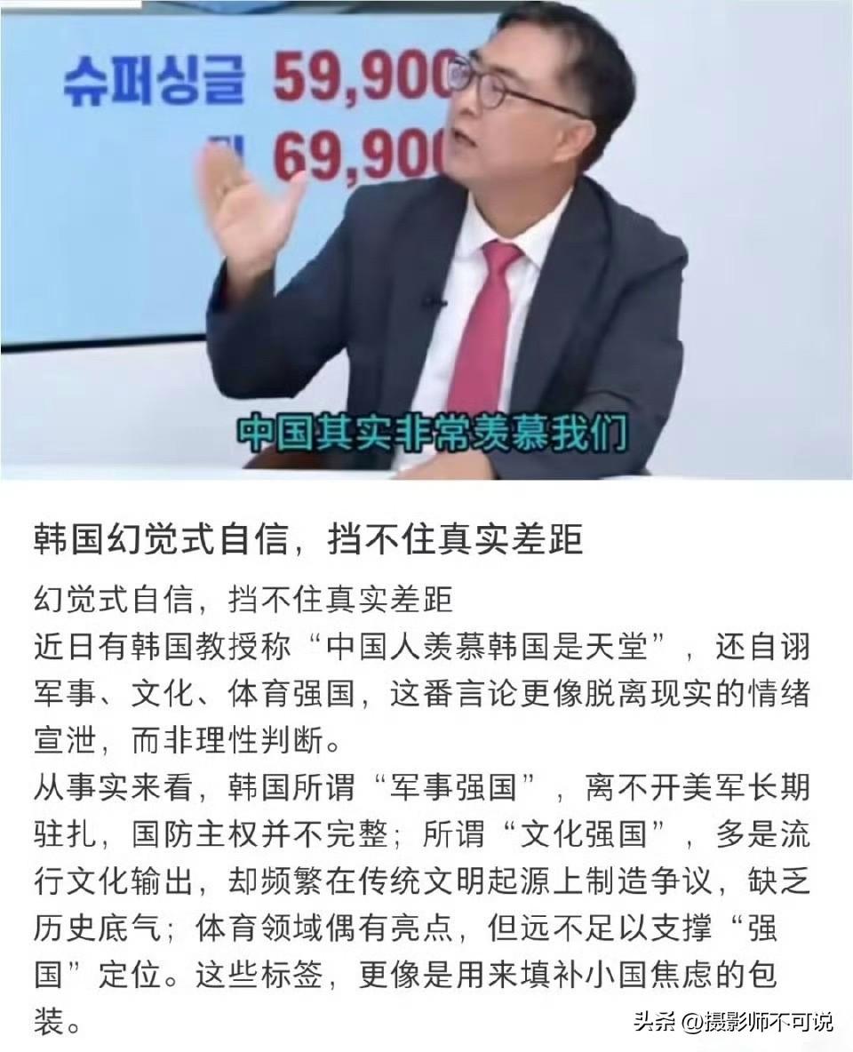 韩国专家自信宣称中国人非常羡慕韩国,其自信程度恐怕也唯有大巴拉特才能与之打个有来有回了。这位专家之所以这么说的依据大概就是其娱乐明星世界知名度更高,体育领域也很有竞争力。好吧,你说韩国爱豆在世界上的知名度相比我国更大,我可以勉强接受,毕竟硅基生物比碳基生物天然更有话题性。就好比四条腿的青蛙并不稀奇,但三条腿的蛤蟆可就难找了!至于体育嘛除了跆拳道、足球等有限的几个以外,其他的恐怕就是一般般了!要是退回去20年韩流泛滥的时候,估计专家说这话会有很多中国人认同。但是现在嘛,估计也只有他自己信了!