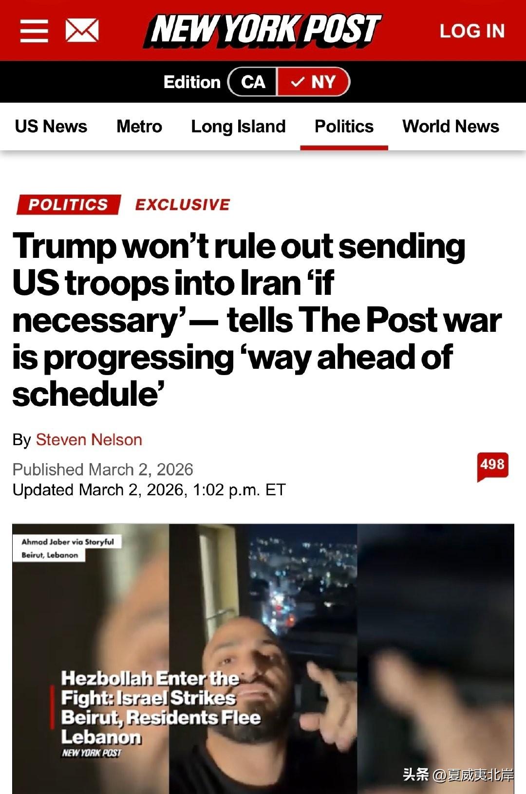 川普在接受《纽约邮报》采访时表示,不排除向伊朗派遣地面部队。
