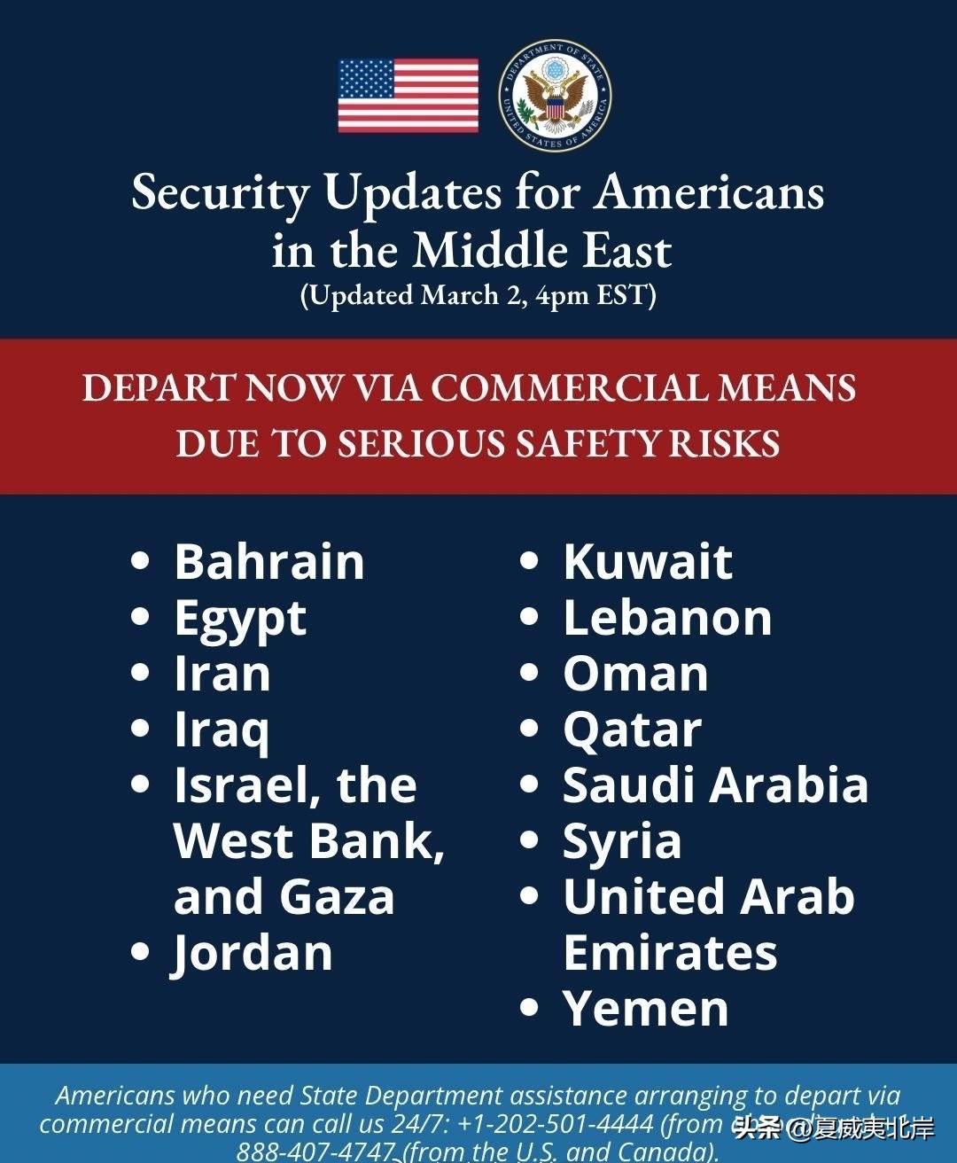 美国国务院针对中东地区美国人的安全更新 因存在严重安全风险,请立即通过商业渠道离境 - 巴林 - 埃及 - 伊朗 - 伊拉克 - 以色列、约旦河西岸及加沙地带 - 约旦 - 科威特 - 黎巴嫩 - 阿曼 - 卡塔尔 - 沙特阿拉伯 - 叙利亚 - 阿联酋 - 也门 如需美国国务院协助安排通过商业渠道离境,可全天候联系我们: - 境外拨打:+1-202-501-4444 - 美国及加拿大境内拨打:1-888-407-4747