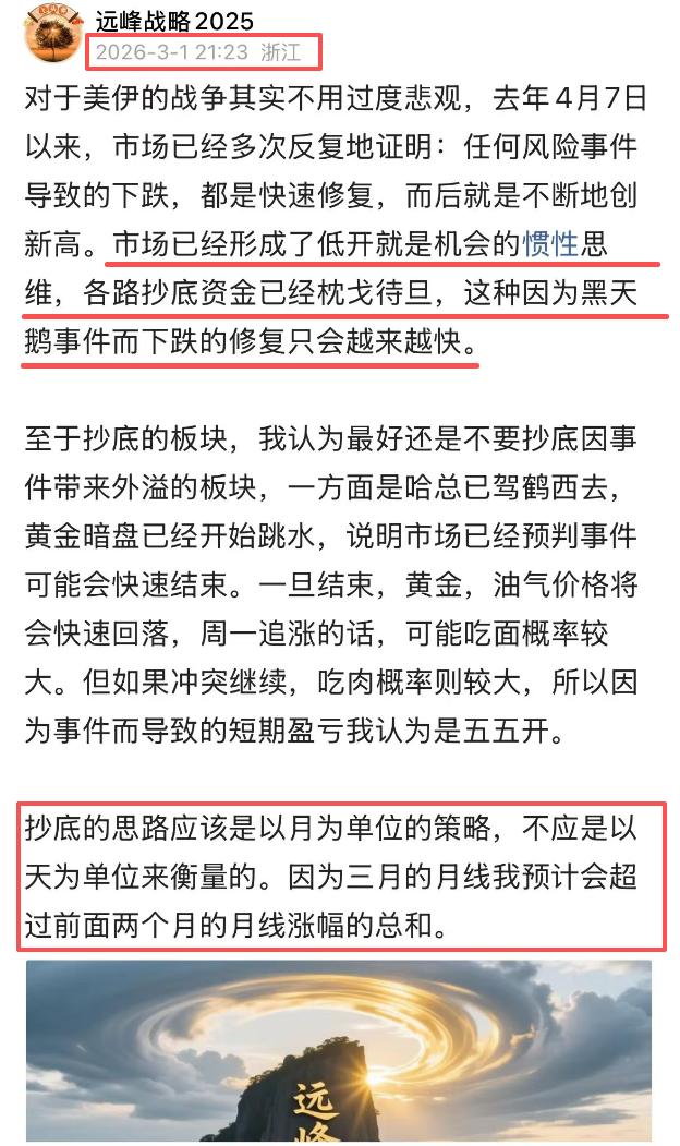 昨日的大盘顶着美伊冲突的压力低开高走,最终收红,跟我周末的看法基本差不多,因为市场经过去经过多次的地缘冲突的洗礼已经形成了低开就是机会的惯性思维,各路抄底资金已经枕戈待旦,这种因为黑天鹅事件而下跌的修复只会越来越快。 从昨天的情况来看,美伊争端对A股的影响应该说偏向中性,甚至于偏积极,因为中东的争端,整个土豪圈里的很多资金就有寻求避风港的需求,而中国目前的地位与安全无疑是中东土豪们的目的地之一。 隔夜,美股三大指数涨跌不一,道指小幅下跌0.15%,纳指涨0.36%,标普涨0.04%,科技股、软件股反弹,可见中东的冲突也并没有改变国际资本对美股的看法。除非国际原油迅速飙升到100美元上方,否则我认为美股依旧没有系统性风险。 再看今天的A股市场,我认为还是有机会冲击前高4190的,这个点位早晚都是要拿下的。