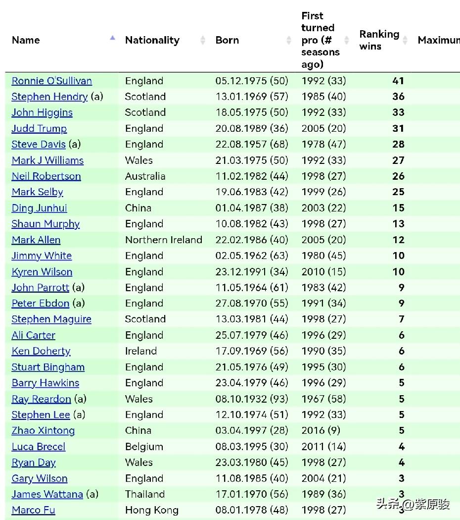 霍金斯46岁夺冠,中国球员40多岁还能打吗? 中国斯诺克梯队中,年轻一代冲劲儿很足,00后的吴宜泽、斯佳辉排名已经位列前16,常冰玉、雷佩凡、江俊也在快速成长中。 90后梯队中,1997年出生的赵心童成绩最突出,目前拿到5个排名赛冠军,尤其是拿到斯诺克三大赛中的两个——世锦赛和英锦赛冠军。1991年出生的张安达也不错,曾经进了前16,目前排名21。1998年的周跃龙曾经无限接近前16,目前排名26。 80梯队中,1989年出生的肖国栋大器晚成,拿到两个排名赛冠军,也稳定在前16中,目前需要巩固前16的位置。1987年的丁俊晖拿到15个排名赛冠军,在排名赛冠军榜上名列第9,其他中国球员短时间内还无法企及。不过近几年,丁俊晖表现一般,引发争议,希望正值当打之年的丁俊晖调整心态。 中国军团中,庞俊旭、周跃龙、吕昊天、袁思俊、徐思需要来一次突破,这种突破除了艰苦的训练,还需要运气。 2001年出生的00后范争一突破了一次,拿到2022年的欧洲大师赛冠军,可是突破后背上了沉重的心理包袱,一蹶不振,已经徘徊在降级边缘,希望小范认真总结,调整心态和状态。 看了排名赛冠军榜,很多三四十岁的球员成绩都不错,包括1982年的尼尔·罗伯逊和墨菲,1983的塞尔比,1989年的特鲁姆普等。中国80后斯诺克球员只有丁俊晖和肖国栋,肖国栋大器晚成,目前比较稳定,而丁俊晖需要尽快调整。 傅家俊出生于1978年,目前持外卡参赛,心态比较佛系。“神奇小子”拿到过3个排名赛冠军,战绩也不错,如果调整心态,再来个突破也不是不可能,七五三杰都50岁了,霍金斯也46岁了。再看1976年的宾汉姆、1979年的卡特,成绩也不错,宾汉姆排名第17,有可能重返前16,卡特排名22。