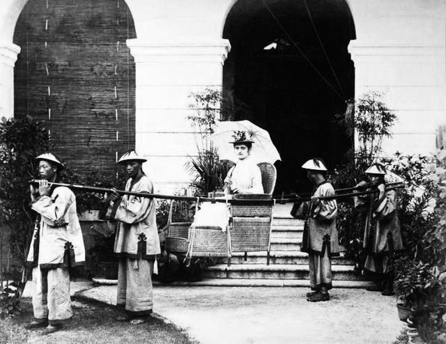 晚清,一位西方女性,很可能是外国公使夫人、传教士或富商的女眷。她身着西式洋裙,头戴遮阳帽,手持阳伞,神态自若地坐在藤轿中。四名中国轿夫身着统一的中式短褂和斗笠,赤足抬轿,这种出行方式,是当时在华外国人常用的方式。 在晚清,清政府曾严禁外国女性乘坐轿子入城,认为这是对天朝威仪的冒犯。但随着列强入侵和不平等条约的签订,这些规定被打破。