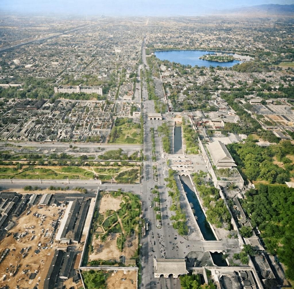 这张珍贵的航拍照片,拍摄于20世纪40年代,照片的视觉中心是贯穿南北的北京中轴线,从近景的正阳门向北延伸,依次是中华门(大清门)、天安门、端门,最终消失在远方的景山。 此时的天安门广场并非如今的开阔广场,而是一个“T”字形的封闭空间。两侧是长长的“千步廊”,东西两侧还有长安左门和长安右门,将广场与长安街隔开,普通百姓无法随意进入。