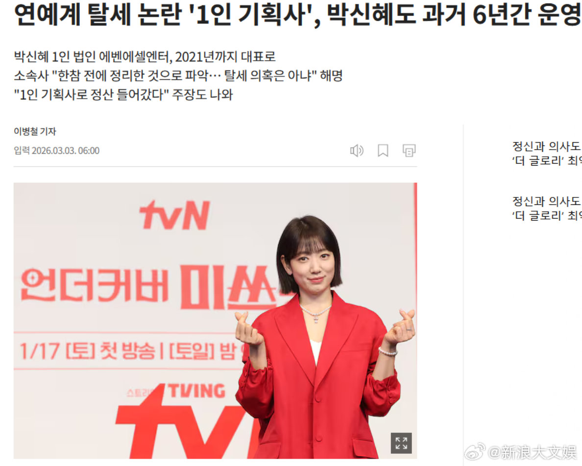疑似朴信惠涉嫌逃税经纪公司否认朴信惠逃税 据韩媒,朴信惠被曝疑似涉嫌逃税。报道称朴信惠从15年到21年长时间运营1人工作室,疑似通过个人工作室结算收益进行逃税,和此前逃税的车银优是相似的事例。对此,朴信惠经纪公司表示她的个人工作室与逃税无关,主张没有通过她的个人工作室给她进行结算。但也有匿名的业界相关人士表示:其经纪公司确实通过朴信惠的个人公司进行了结算。