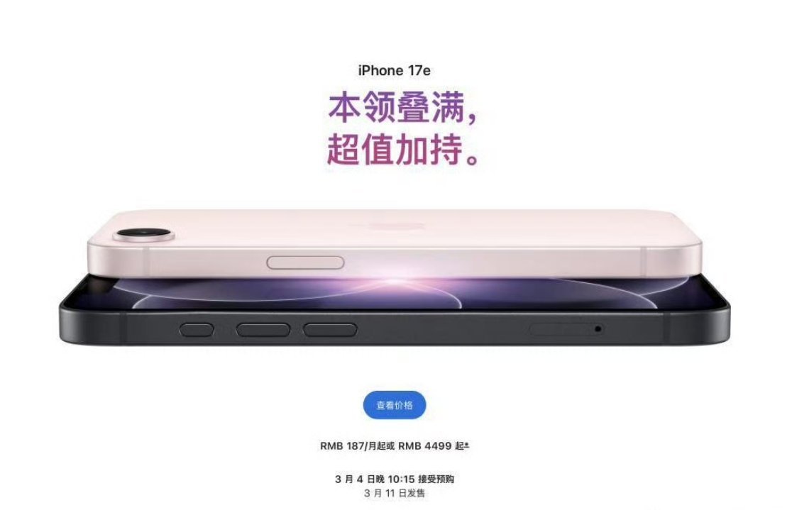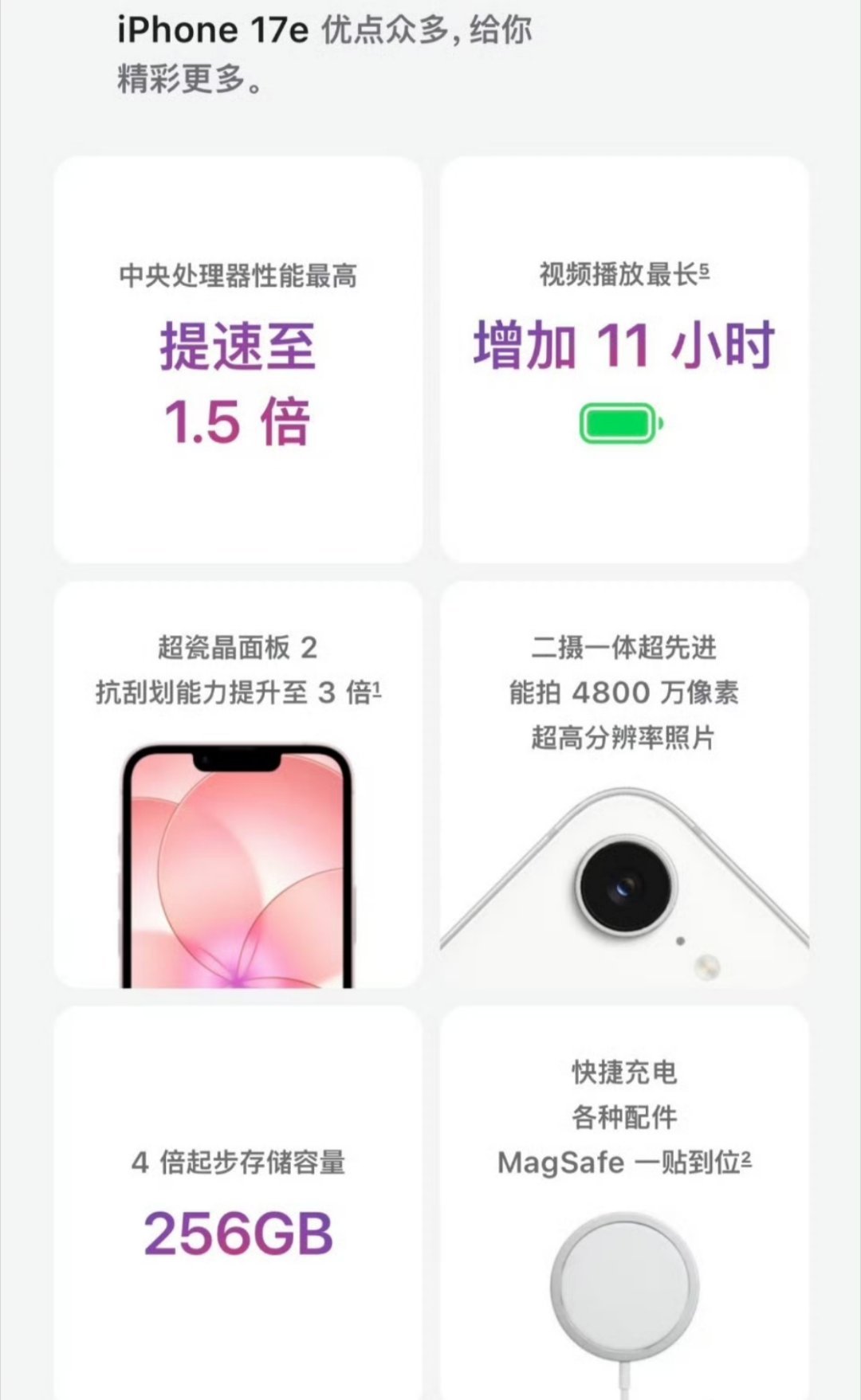 苹果推出大量粉色配件这个系列的手机,还是更偏向赚女性用户的钱…虽然iPhone 17e好看精致、机身小巧,但咱们女生也不傻:没有灵动岛,还是60Hz刷新率,单卡,唯一实在的就是起步256G,配了A19处理器。4499这个价格综合来看还是偏贵……而且现在网传iPhone18也会出粉色款,想换新机的其实可以再等等看