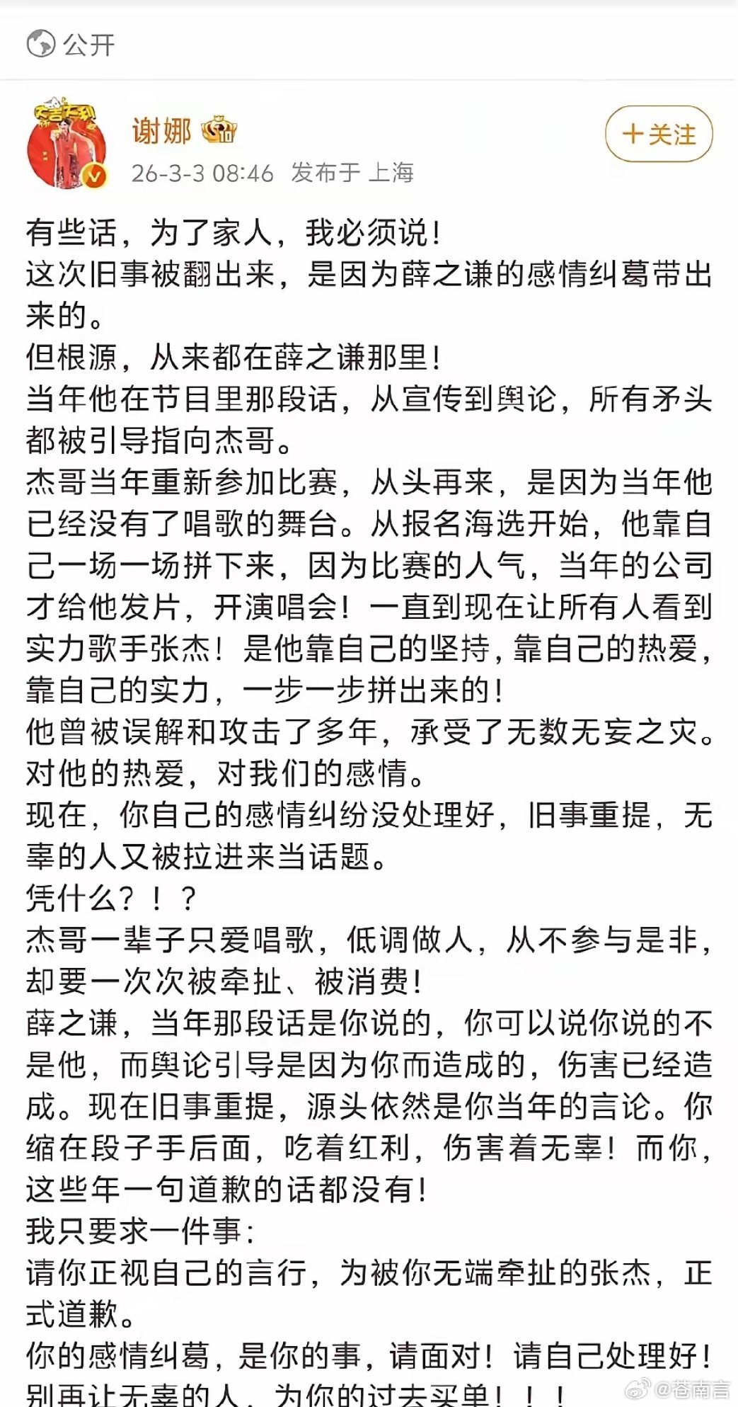 谢娜喊话薛之谦如今,薛之谦的私人感情纠纷再次将旧事翻出,张杰又一次无辜被拉来“消费”。谢娜在长文中字字铿锵,直言张杰一生挚爱唱歌、低调做人,不该一次次为他人的是非买单。她明确提出唯一诉求:希望薛之谦正视言行,为当年的言论给张杰一个正式道歉,妥善处理自己的感情纠葛,别再让无辜者为他的过去买单。你怎么看待这件事呢?